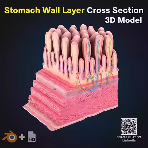 A high-quality, scientifically detailed 3D model of the Stomach Wall Cross Section. This model illustrates the complex histological layers of the stomach, from the inner mucosa featuring gastric pits and villi-like structures to the external muscular and serosa layers. It is perfect for medical education, gastroenterology studies, and high-end scientific visualizations.