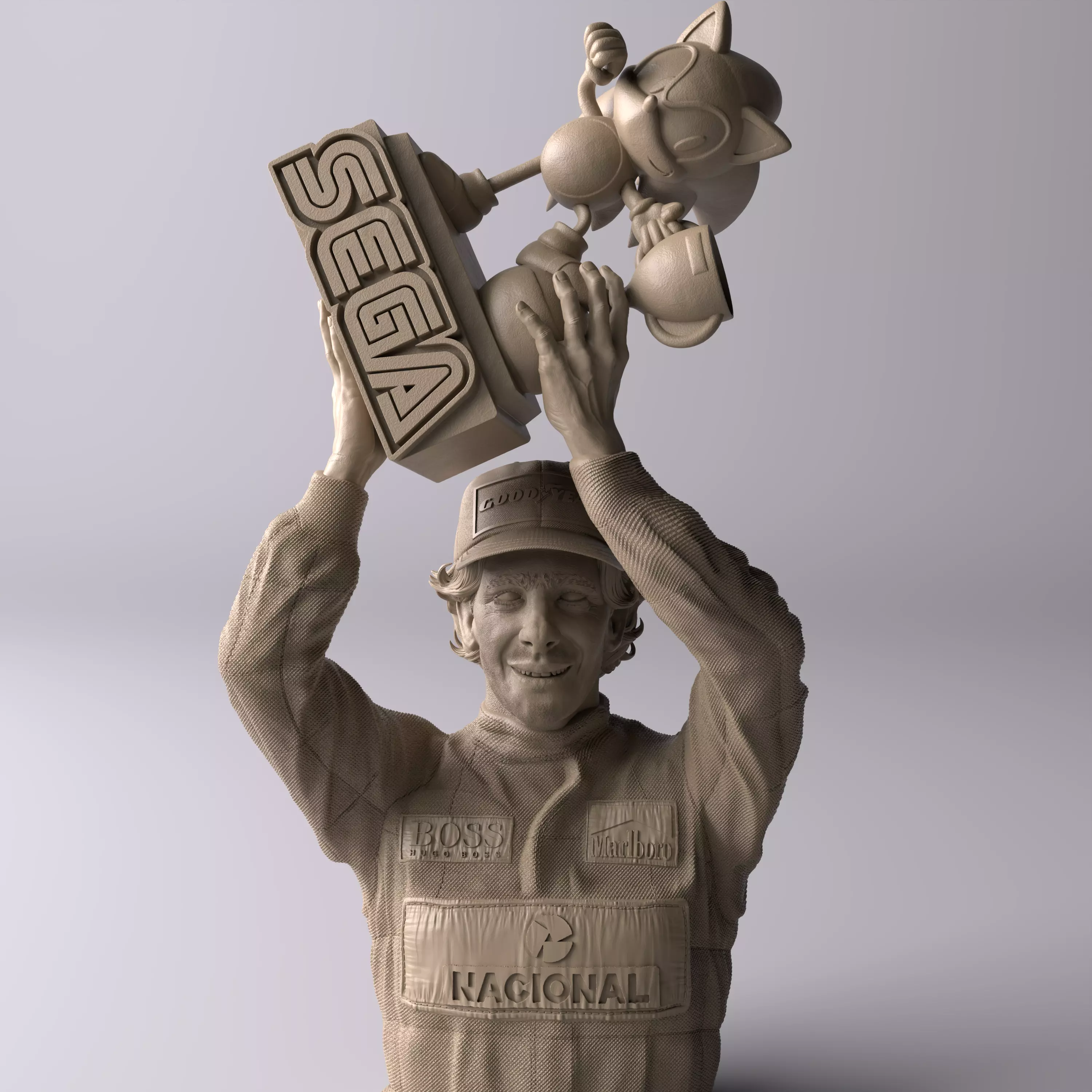 High-quality 3D printable premium statue inspired by Ayrton Senna holding the iconic 1993 Sonic trophy, capturing one of the most unique and memorable podium moments in Formula 1 history. This collectible figure represents Senna’s charisma, competitive spirit, and legendary status, combining racing excellence with one of the sport’s most unusual and iconic trophies.