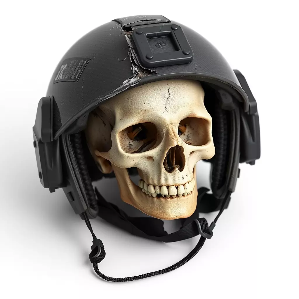 This highly detailed 3D model features a realistic human skull encased within a modern, tactical military helmet, showcasing authentic wear and battle damage, including a visible crack. The model is meticulously crafted to convey a grim and impactful aesthetic, perfect for conveying themes of war, mortality, or post-apocalyptic scenarios. It is ideal for a wide range of creative projects, including immersive game development, cinematic cutscenes, high-quality digital art, and realistic architectural visualizations that require a somber or historical element. With clean, optimized topology and UV unwrapped meshes, this asset is well-suited for both real-time applications like AR/VR experiences and static renders, ensuring efficient performance without sacrificing visual fidelity. PBR textures are included, providing realistic material properties and an aged, weathered look to both the bone and the helmet's surface. Supported file formats typically include GLB, OBJ, FBX, USD, DAE, ABC, and PLY, ensuring broad compatibility across various 3D software and game engines. This asset is perfect for adding a powerful, narrative-driven prop to any virtual environment.