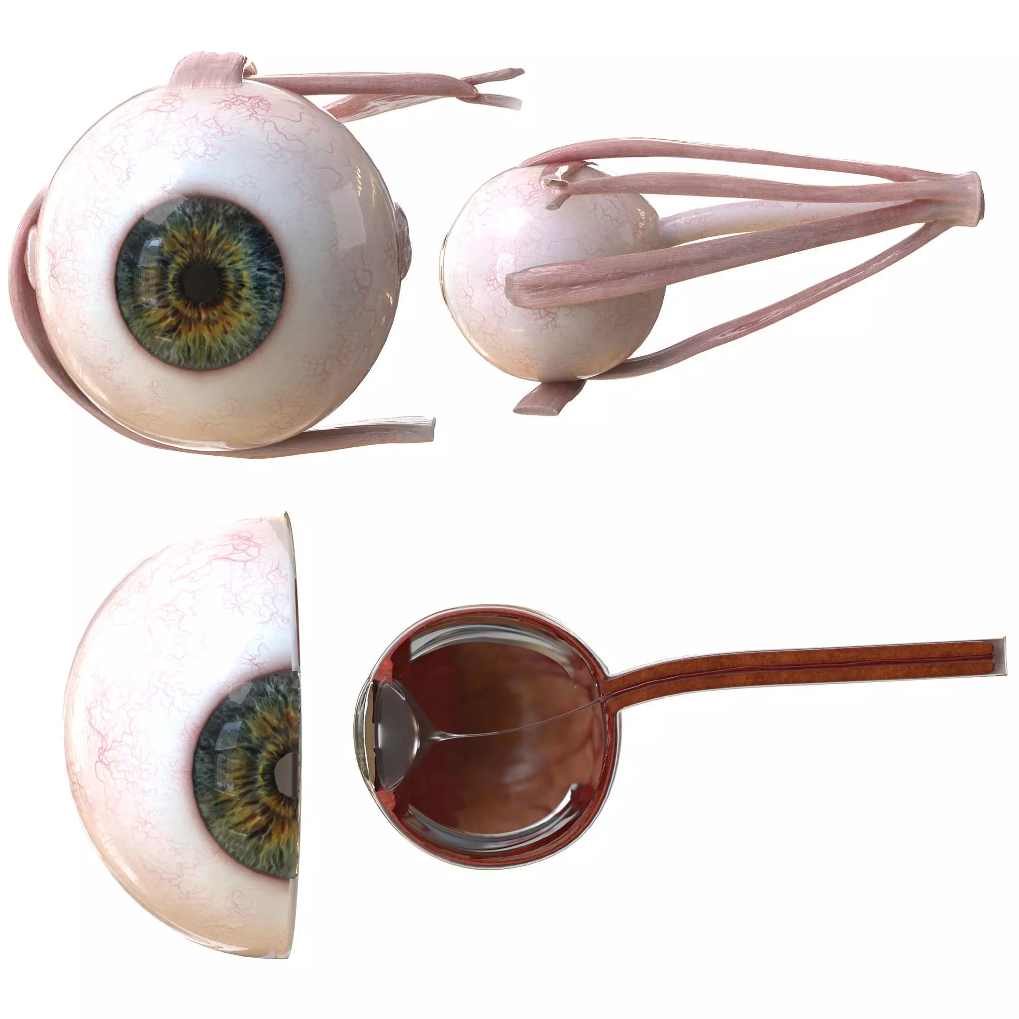 Cross-Section and Full Left of the Human Eye Right Part anatomy. This model is a high quality, photo real 3d model that will enhance detail and realism to any of your rendering projects