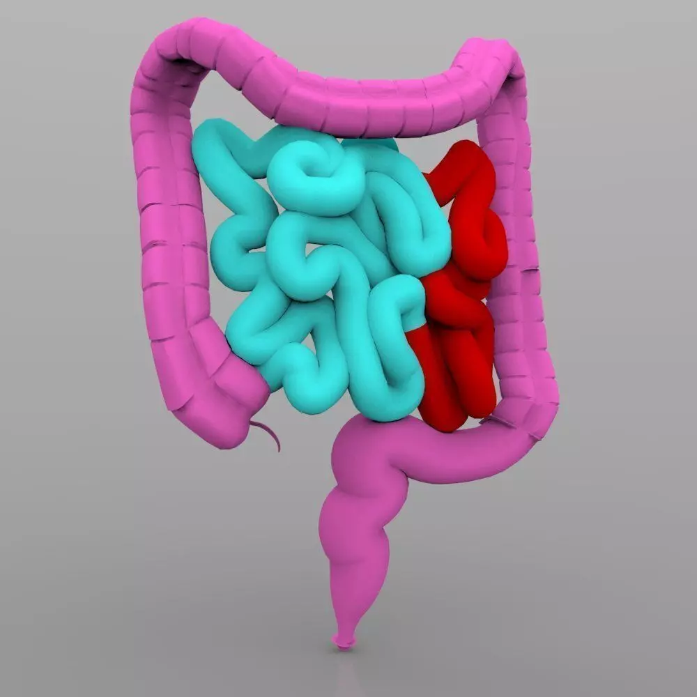 This is a model of the intestines typically found in human males. This model has its parts color-coded, which makes it great for illustrations and educational uses.