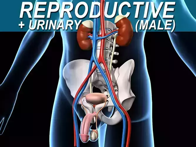 A transparent human model ( with male genital ) is included, to give a sense of the organ's location, without cluttering the important details inside.