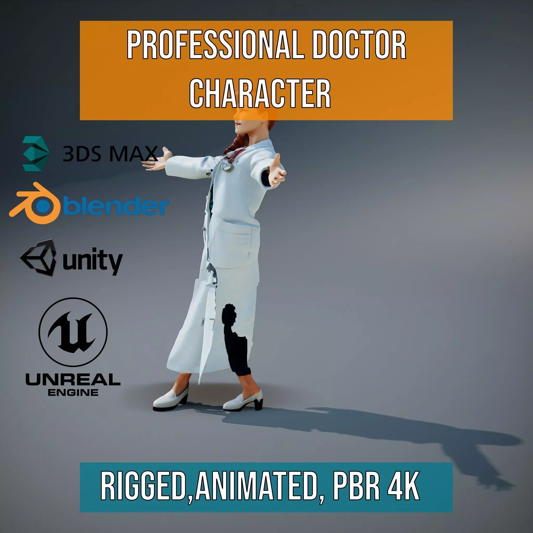 This 3D model pack features a professional doctor character designed with realistic details, perfect for medical simulations, educational tools, and virtual reality healthcare experiences. Each model has 3 levels of detail: low-poly (1000 triangles for mobile), middle-poly (10,000 triangles for environment), and high-poly (100,000 triangles), which allows for the use of this model in production rendering (such as 3ds Max, Maya, Cinema 4D, Blender, Vray/Corona/Cycles and all other), game engines (Unity and Unreal compatible), and interactive presentations, providing a choice of detail based on the LOD System principle. The model's textures are PBR, Diffuse, NormalMap, and reflection/roughness/metallic, suitable for any modern rendering engine. All models are accurately unwrapped with no overlapping UV. All textures are 4096x4096 in size. Please like and leave a comment if you enjoyed the model.