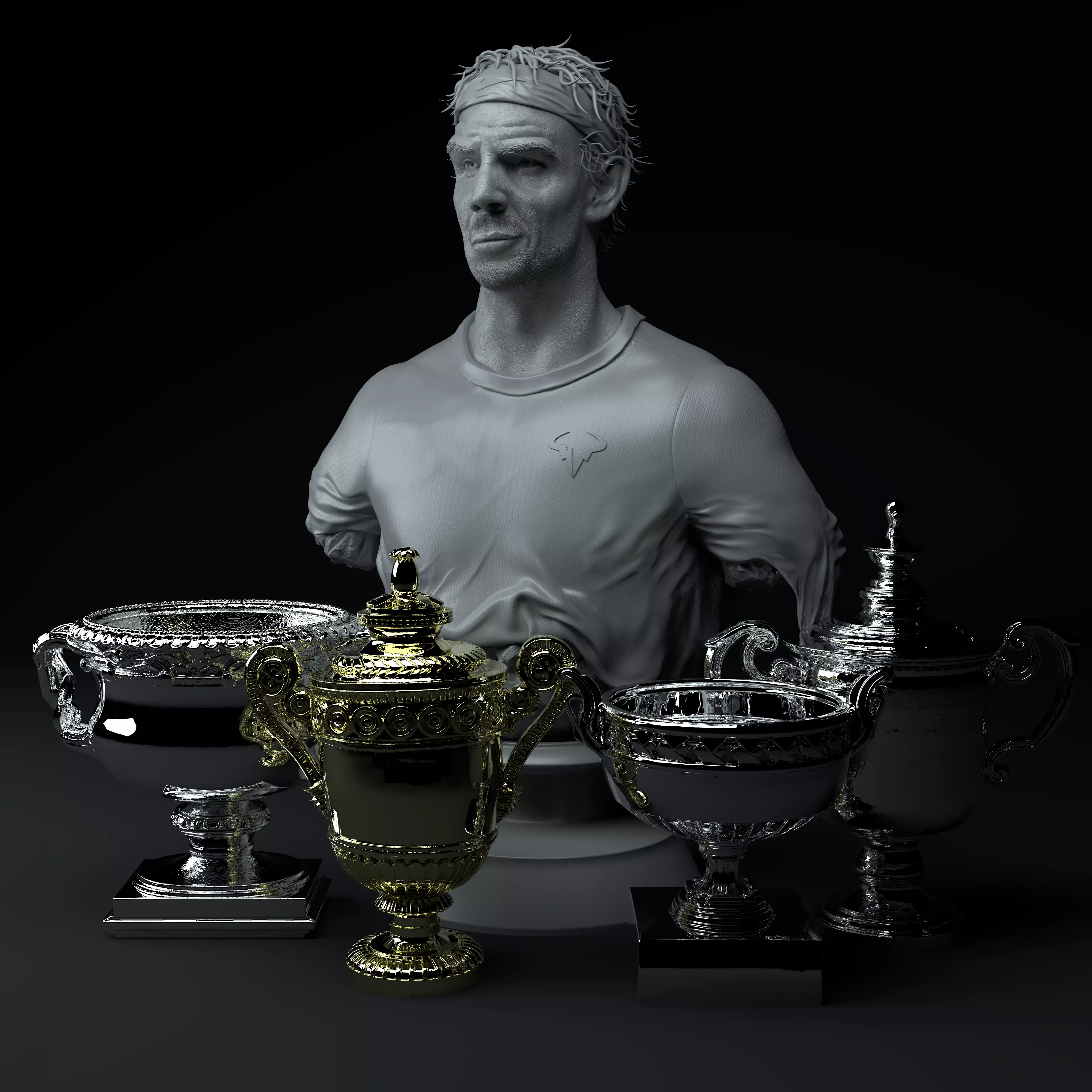 This tennis diorama features Rafael Nadal alongside his Grand Slam trophies, his iconic racket, and a themed display base, celebrating one of the greatest champions in the history of the sport. Designed for collectors, tennis fans, and 3D printing enthusiasts, it combines realism, clean forms, and print-friendly details ready for premium display.