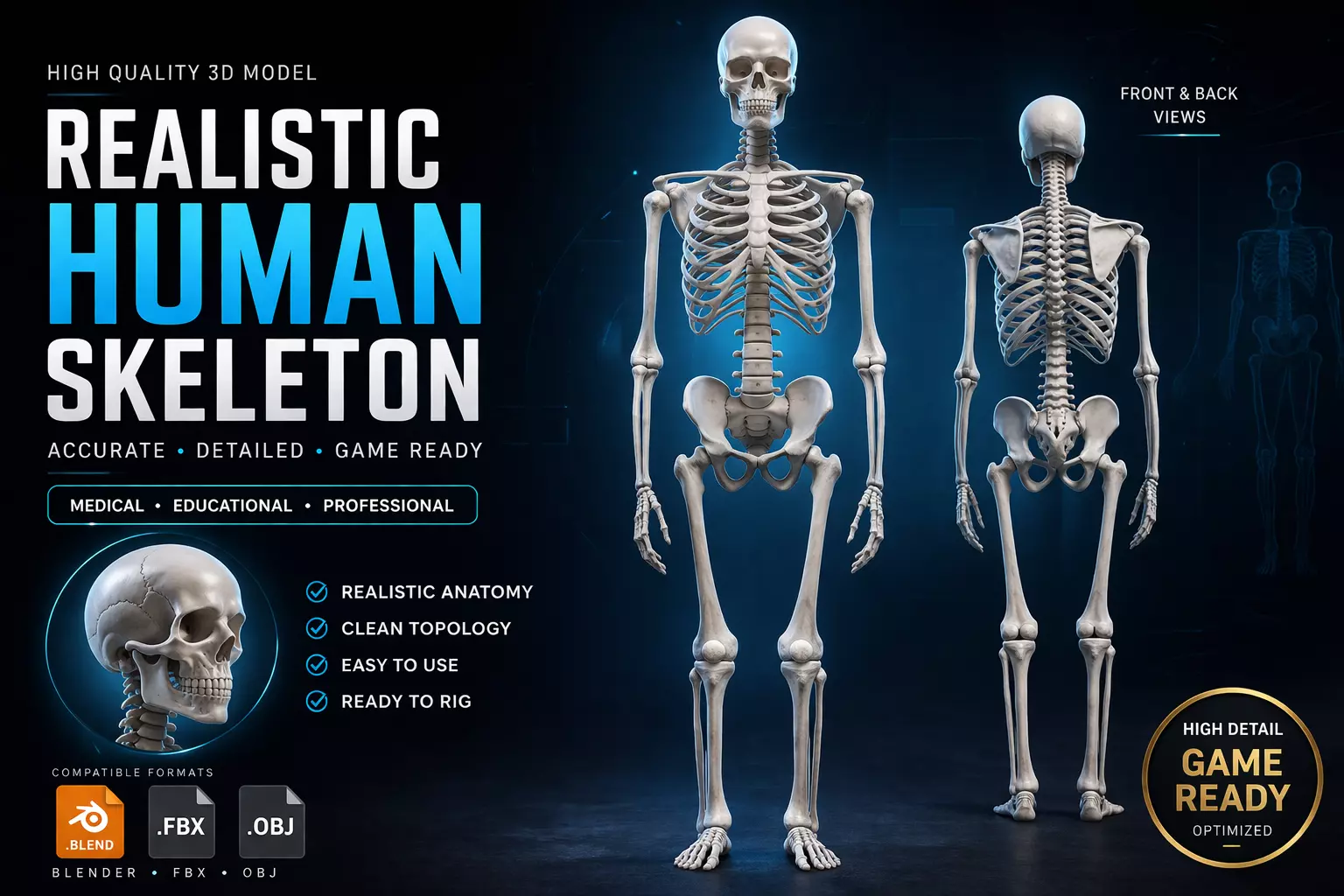 High-quality realistic human skeleton 3D model with accurate anatomical structure and clean topology. This model is designed for professional use in games, medical visualization, education, and animation.