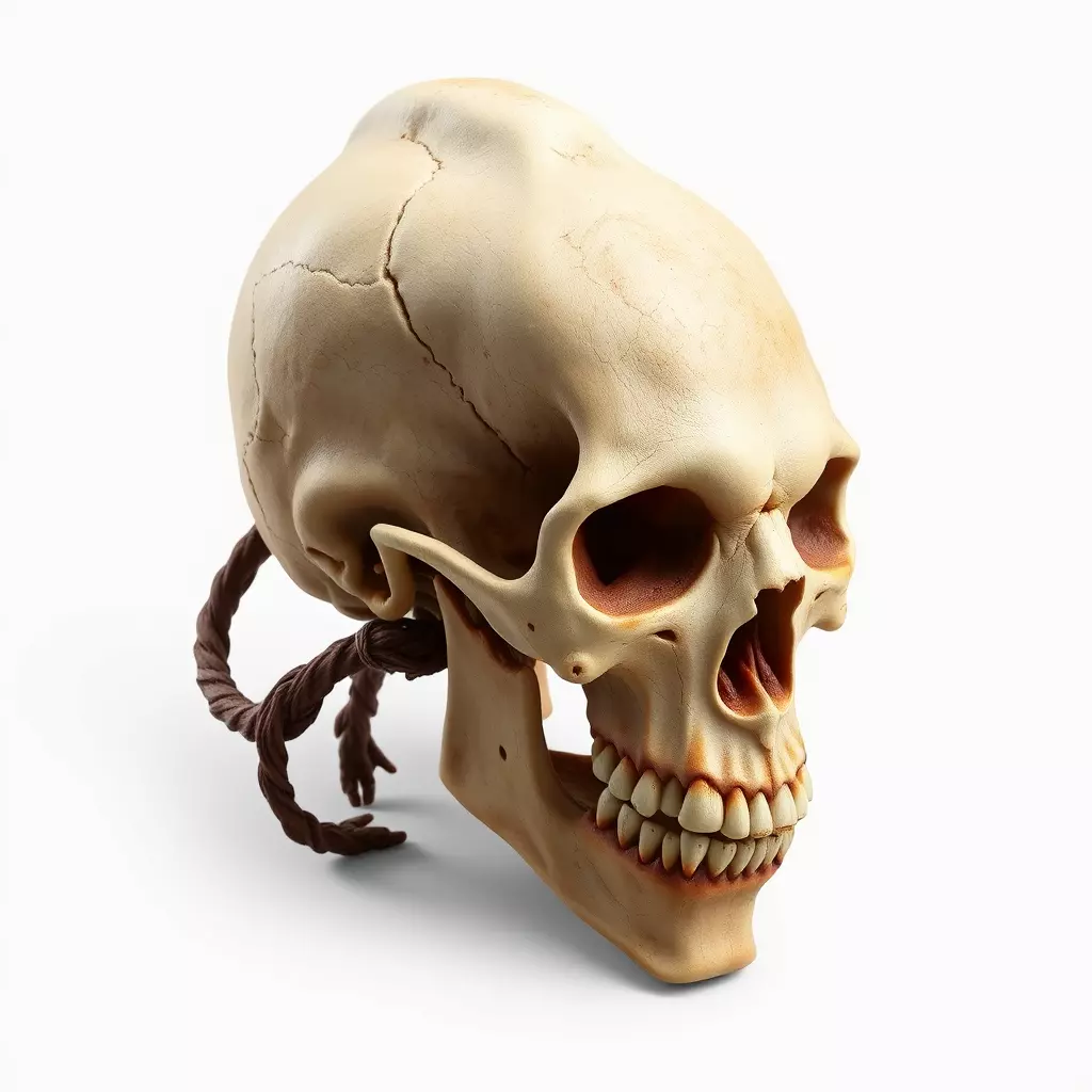 This meticulously crafted 3D model presents a distinctive stylized skull, featuring an elongated cranium that gives it an otherworldly, almost alien appearance, fused with classic human anatomical elements. A detailed, rope-like texture is intricately wrapped around the jaw area, adding a unique, macabre touch to its design. The model boasts a realistic bone texture with subtle color variations and surface cracks on the cranium, enhancing its authenticity and weathered look. This versatile asset is ideal for a wide range of creative projects, including immersive game development, creating compelling scenes for augmented reality (AR) and virtual reality (VR) applications, dynamic film and animation productions, or as a striking element in digital art compositions. It is optimized for real-time engines, ensuring smooth performance in interactive experiences, while also being perfectly suited for high-quality static renderings and detailed close-ups in architectural visualizations or cinematic projects. The model comes with clean topology, ensuring smooth deformations and easy integration into various pipelines. It is fully UV unwrapped for straightforward texture application and is designed with PBR (Physically Based Rendering) textures to deliver lifelike material representation across different lighting conditions. Supported file formats include GLB, OBJ, FBX, and USD, making it highly compatible with most 3D software and game engines.