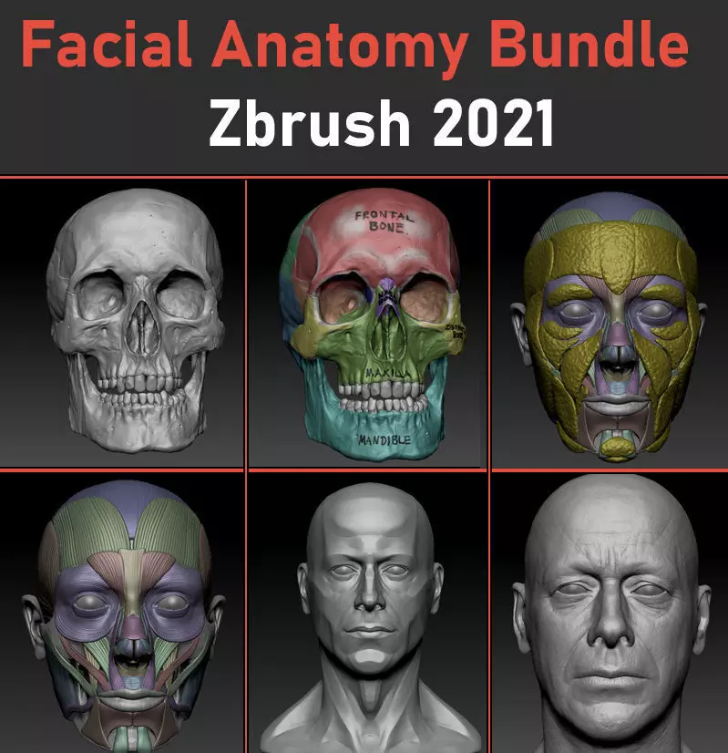 The perfect bundle for Anatomy and Head sculpting enthusiasts. Contains the following files for Zbrush 2021 (.ztl), as well as decimated .obj:Use the anatomically correct skulls to sculpt more realistic heads. Facial Muscles and Facial Fat compartments will give you the kind of information that can significantly improve your Sculpts.