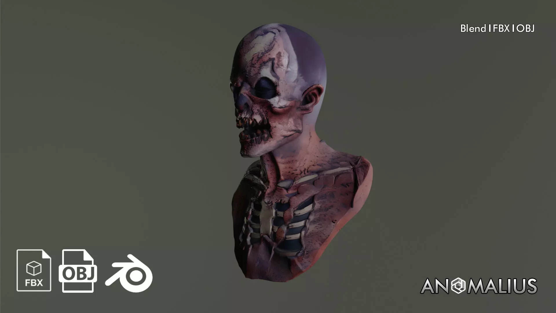 Horror zombie bust featuring a decayed undead head and upper torso with exposed ribs, torn flesh, and damaged facial structure. The sculpt emphasizes disturbing anatomical damage, cracked skin, and skeletal elements, making it suitable for horror games, dark fantasy scenes, zombie environments, or post-apocalyptic projects. Includes Blend, FBX, and OBJ formats