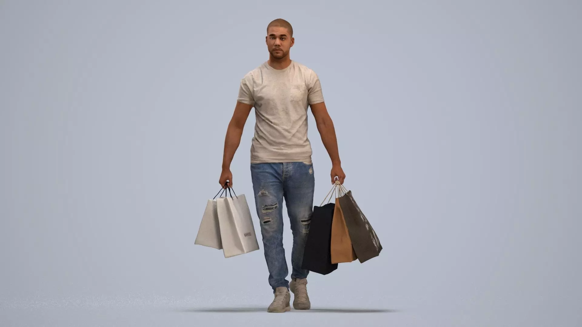a man in a white t - shirt is holding shopping bags