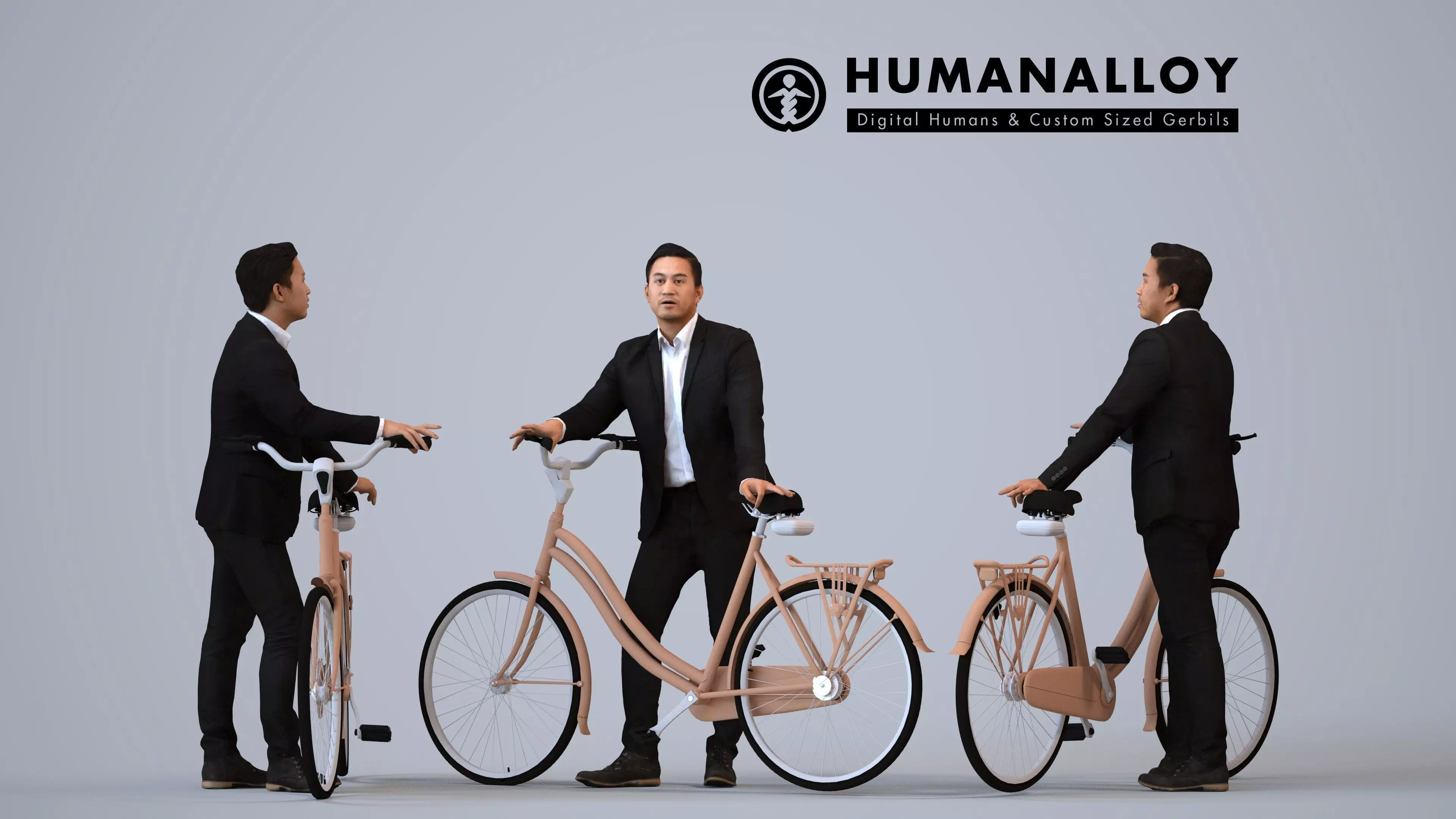 Adult Asian man commuting with bicycle in business attire, transitional seasonal clothing.