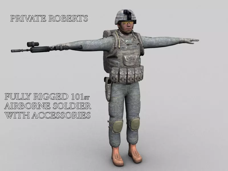 DETAILSThe 101st Airborne are a real regiment from the United States. They date back to before the 2nd world war and have been involved with pretty much every conflict throughout the world ever since. This figure is fully rigged and animatable, he has many accessories that can be unhidden and used to suit your scene.