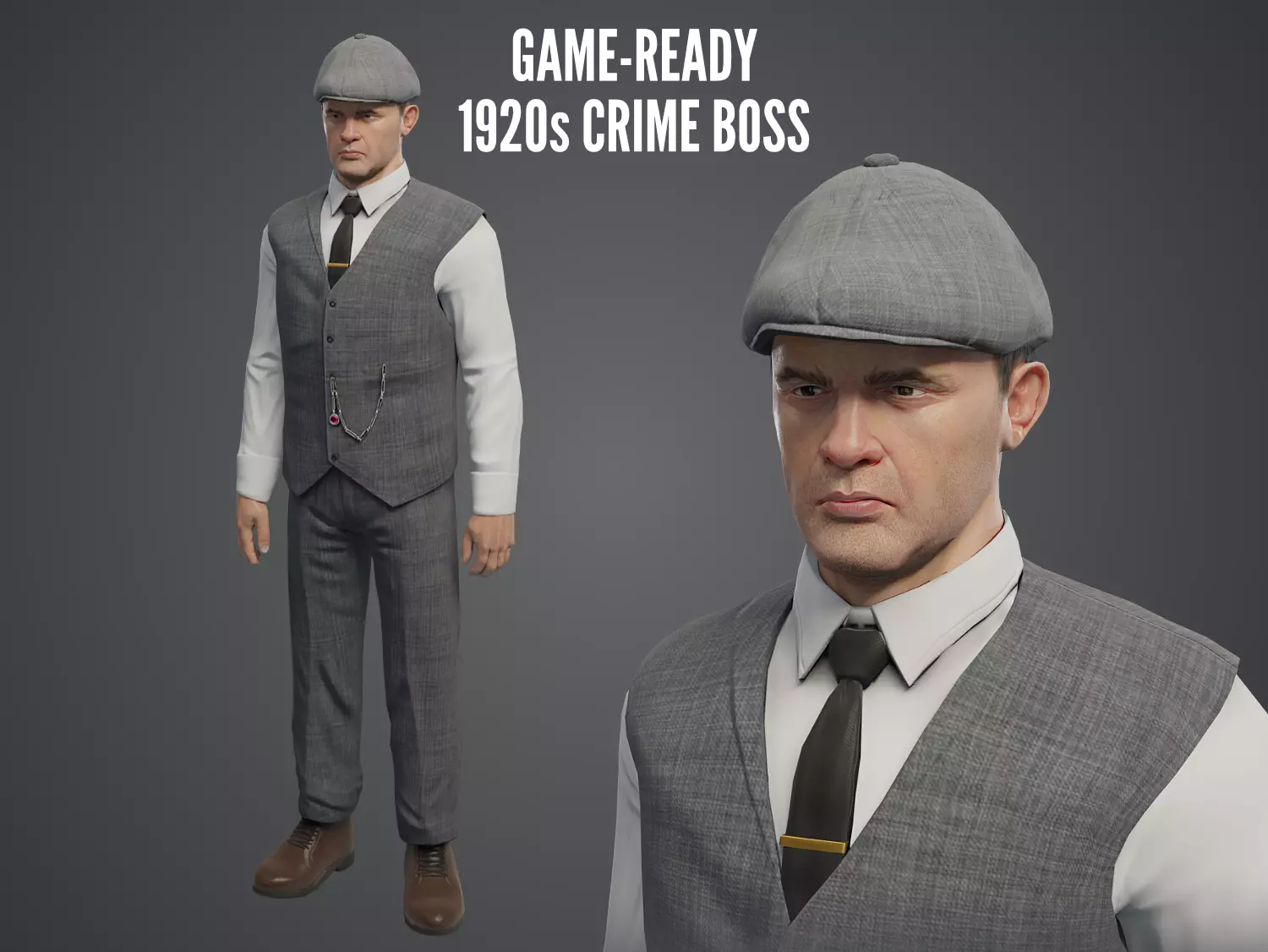 Game-ready, realistic rigged gangster character in the style of the popular TV show Peaky Blinders.