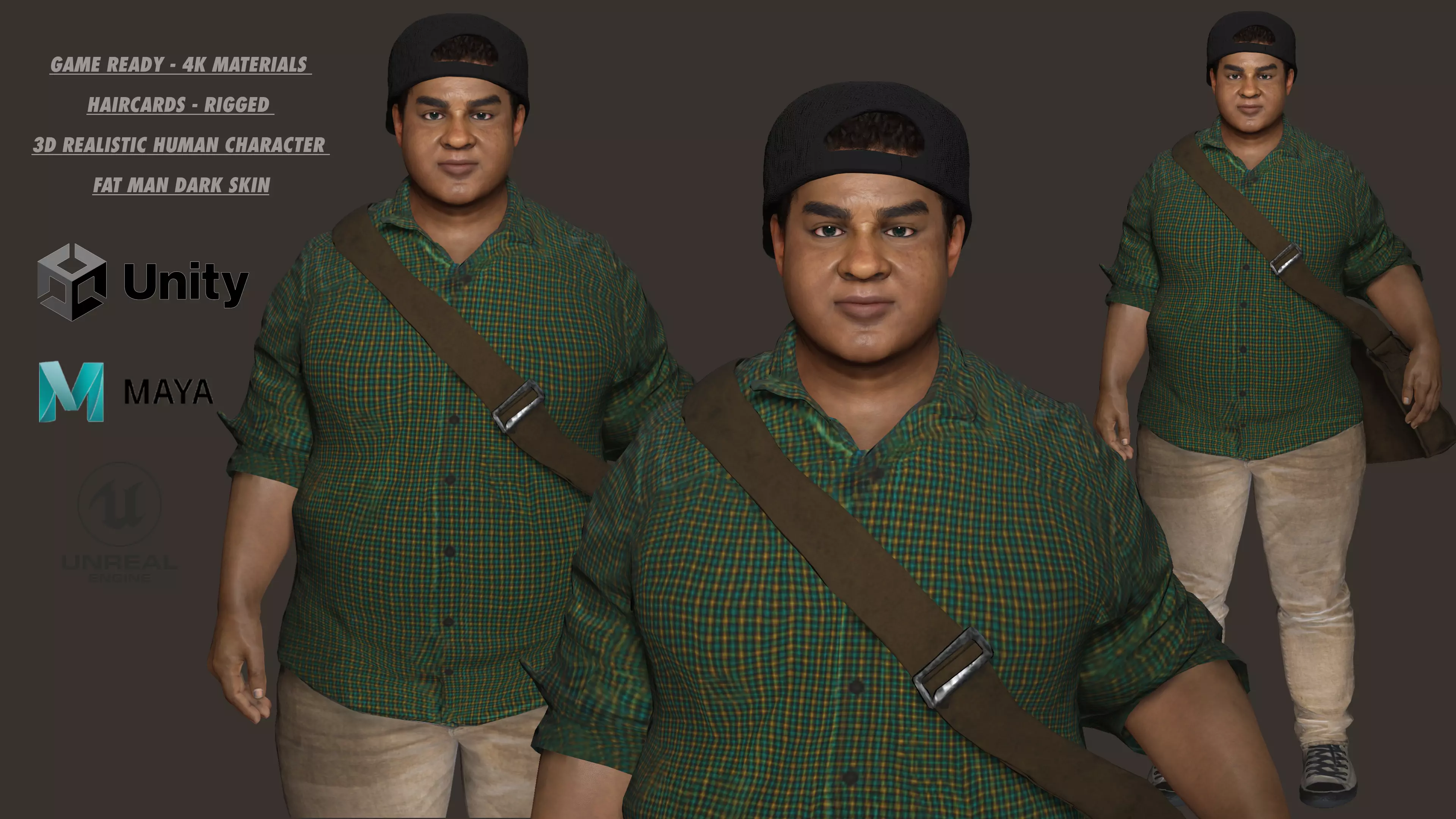 This realistic 3D fat male character features a casual, everyday look — ideal for use in games, cinematics, VR/AR environments, and commercial projects. The model is created with clean topology, realistic PBR textures, and is rig-ready for animation. Dark Skin Tone and Fat body type.