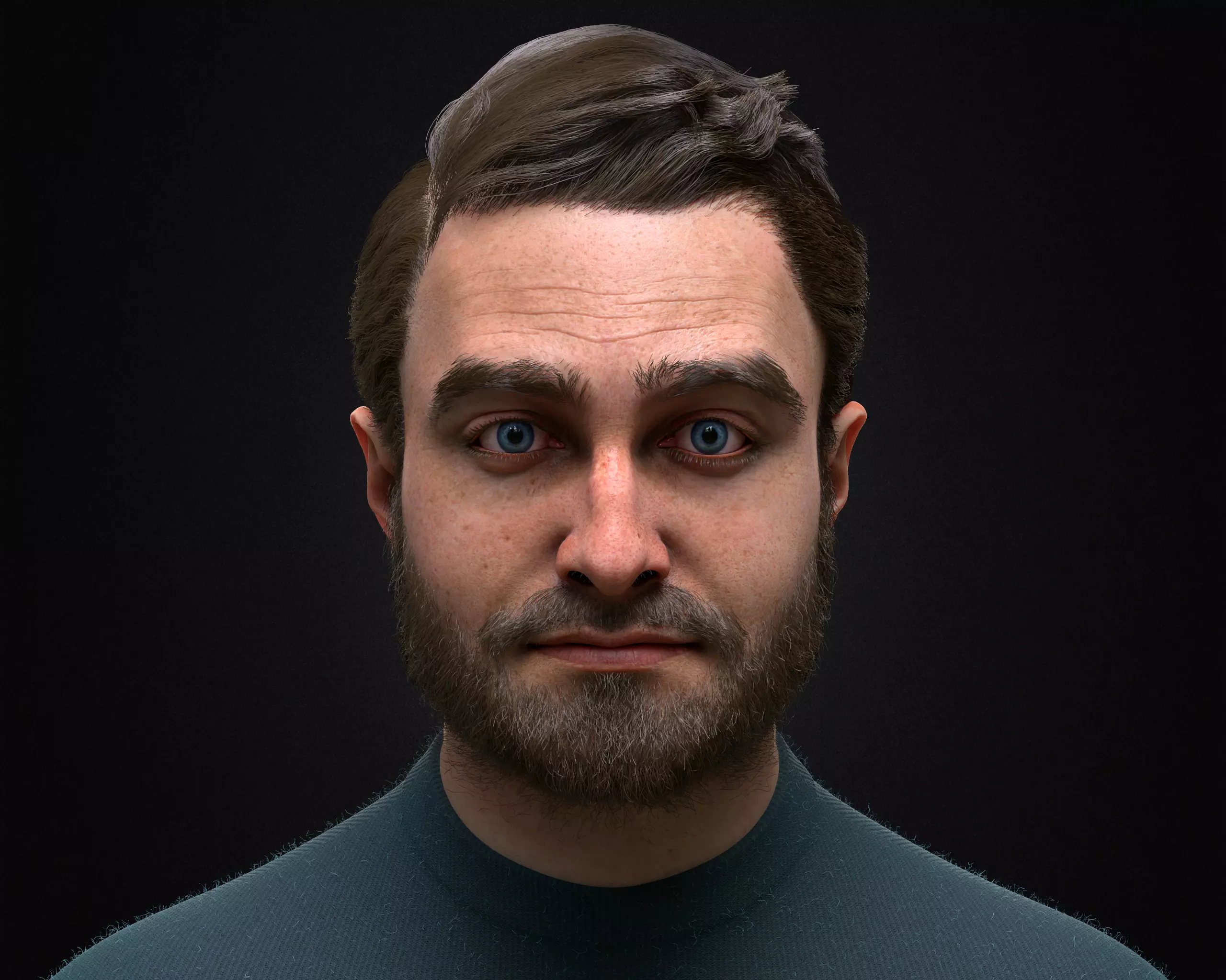 Realtime male headSculpted in ZbrushRetopology and UVs in MayaTexturing in Mari (8K)Used Xgen core for the hairRendered in Marmoset Toolbag 4