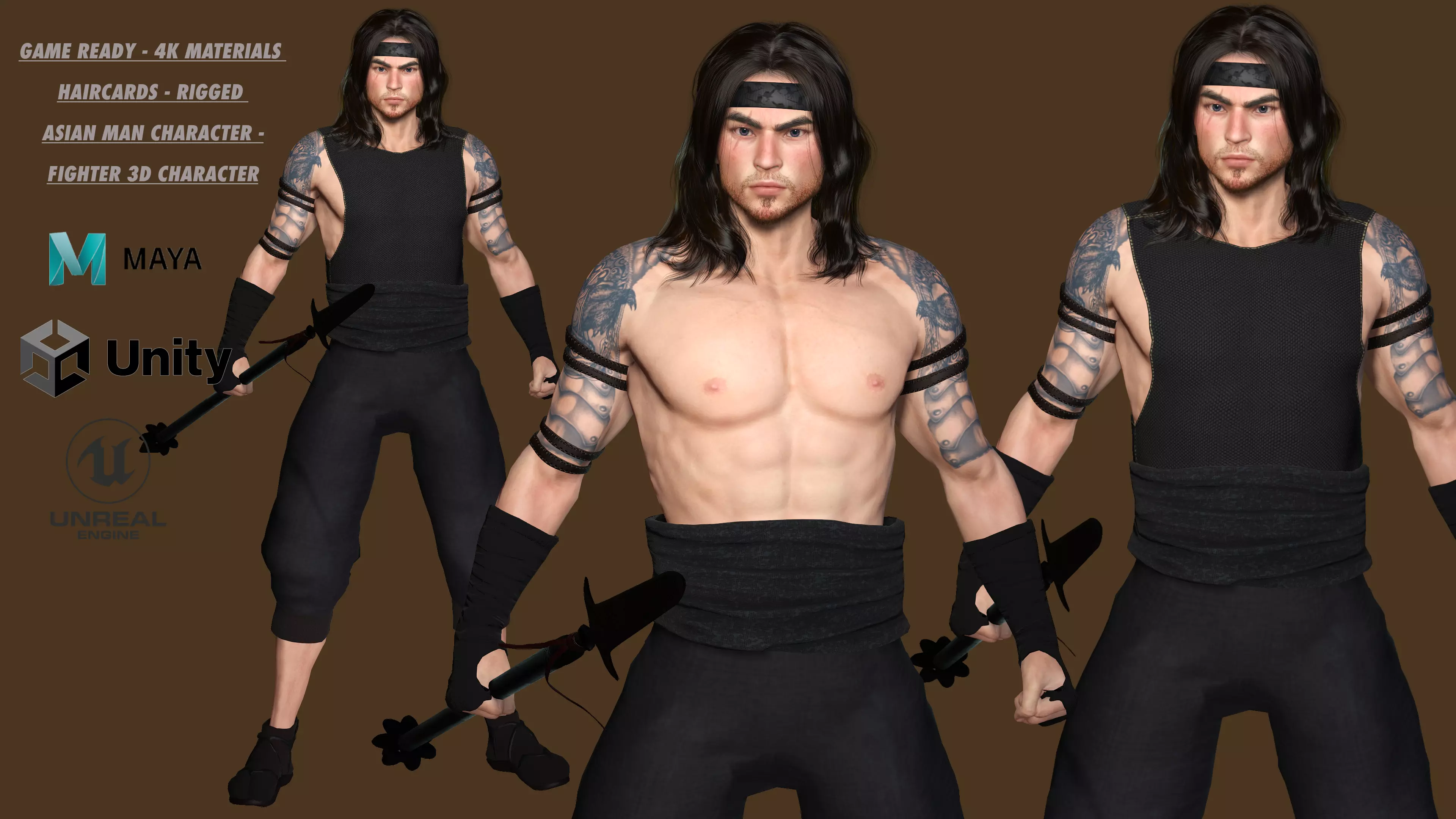 Muscular Asian Man, Asian Fighter Outfit , Manly Asian Face, Straight hair, Light Skin, Black eyes, Dark hair, Muscular Body Type, Beard, Moustache , Tshirt, Shoes, Gloves, Pants, Armband, Spear/ Sword, Headband, Belt, tattoos