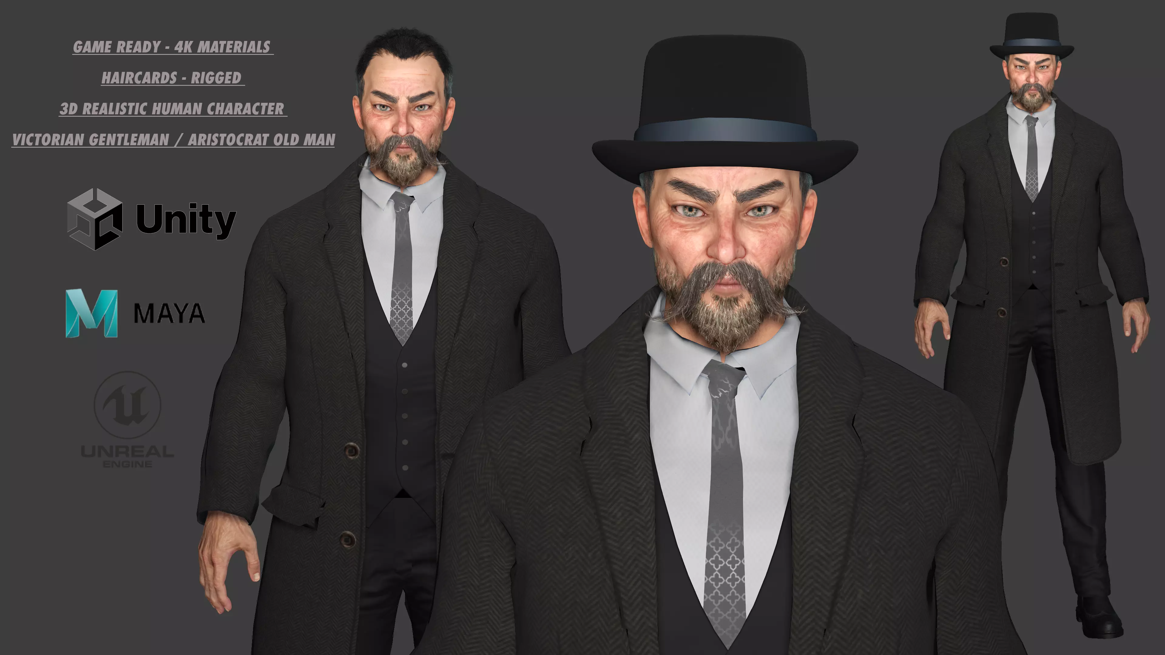 Victorian Gentleman 3D Character – Realistic Male Model with Overcoat, Hat & Beard | Game-Ready, Rigged, PBR