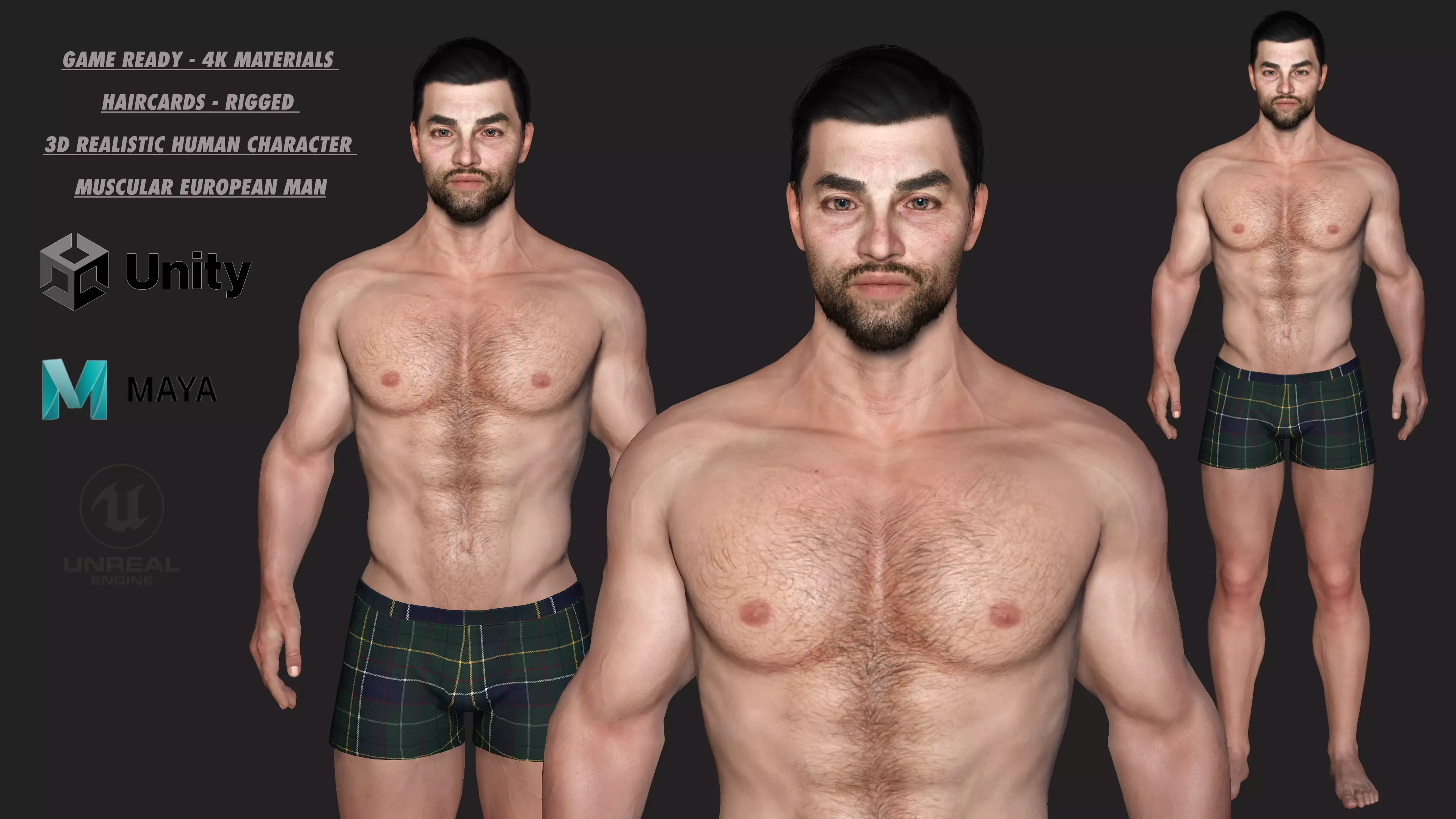 This character included with boxers, Beard, Eyebrow, Hair. Muscular Man, European Face, NPC, Black hair, White Skin, Brown eyes, Muscular Body Type.