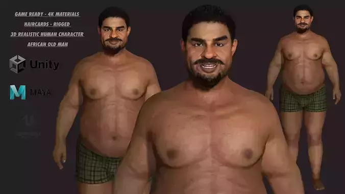 This character included with boxers, Beard, Eyebrow, Hair. Overweight Man, African Fat Guy, NPC, African Face, Black curly hair, Brown Skin, Dark eyes, Fat Body Type.