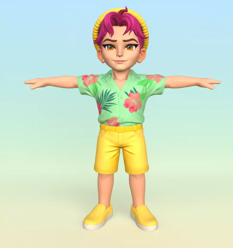 Abby Saja - KPop Demon Hunter is retopologized and fully ready for use in game engines.This model features a bright summer vacation look for the KPop Demon Hunters character. Abby Saja is dressed in a tropical Hawaiian shirt with floral prints, matching yellow shorts, and his signature beanie. The model has material with textures. Hope it will be useful for you!