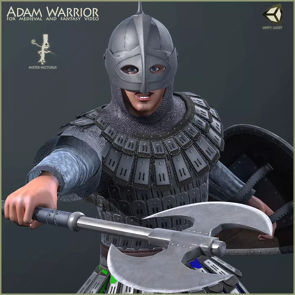 Body parts: Head, Hair, Hands, Arms, Torso, Legs, Feet, included in 3D MAX file.Armor parts: Chest Armor, Helmet, Skirt, Belt, Boots, Shirt, Collar armor.Weapons: Shield, Axe