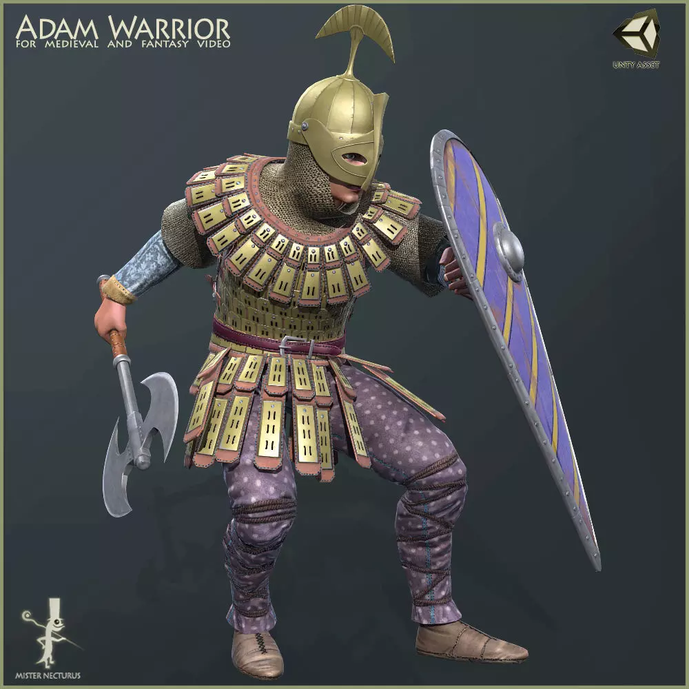 Body parts: Head, Hair, Hands, Arms, Torso, Legs, Feet, included in 3D MAX file.Armor parts: Chest Armor, Helmet, Skirt, Belt, Boots, Shirt, Collar armor.Weapons: Shield, Axe