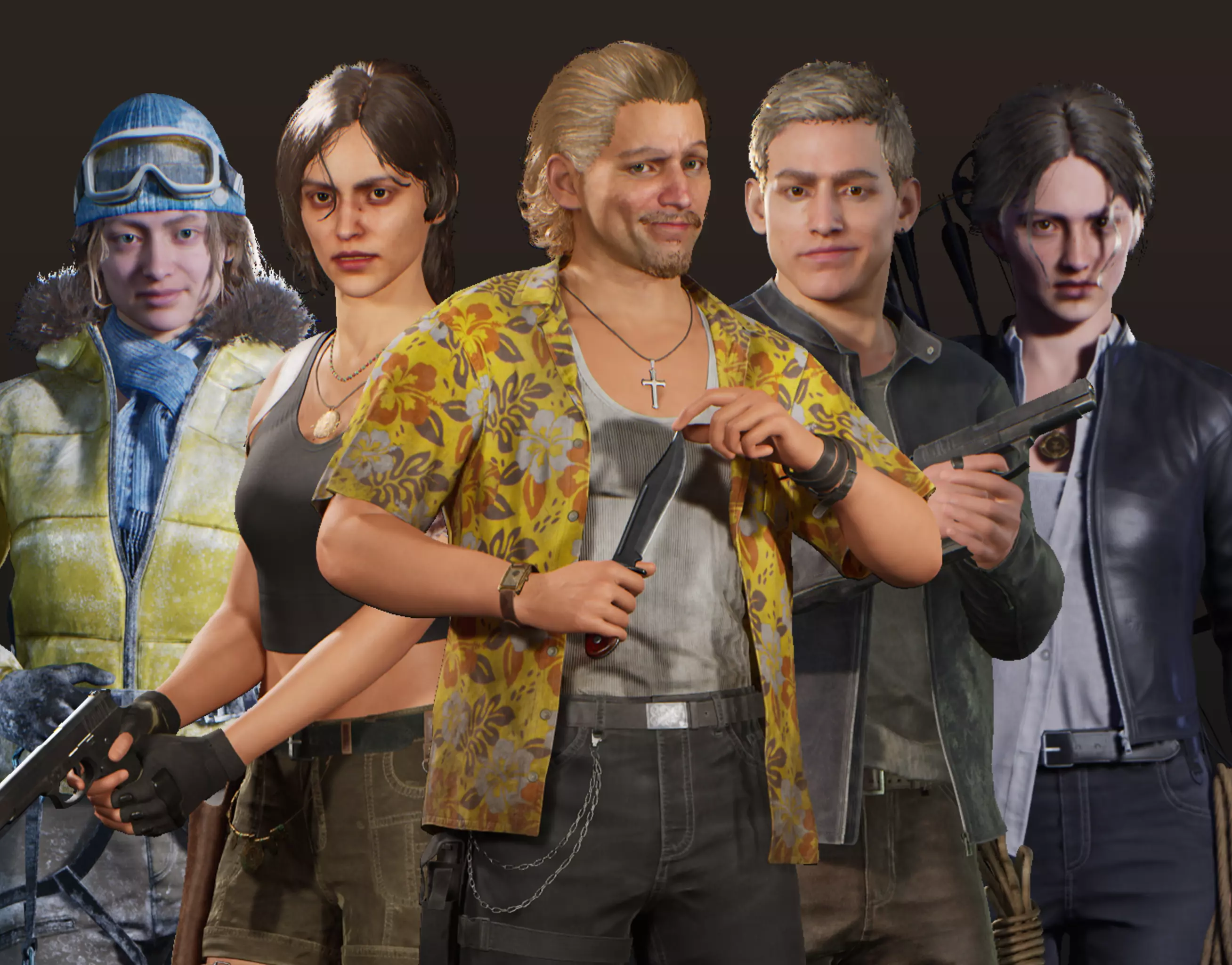 - Characters have their own set of weapons - pistol, bow, axe, knife, ice pick, as well as a list of accessories