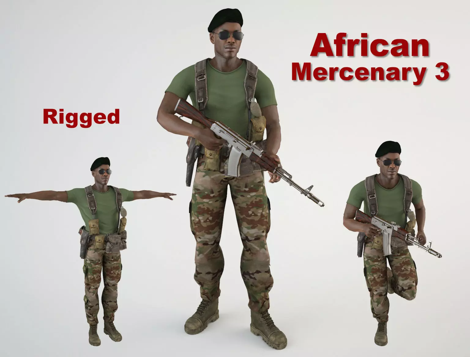 3D model of an African mercenary with military clothes and a submachine gun AK 74. The model includes bones and several animations as an example. The model is also ideal to be used in games. Medium and low-poly models to be used easily in any project.