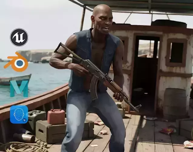 This stylized Somali pirate-inspired character features a muscular build, intense facial expressions, and a rugged denim vest look. Fully rigged for body and facial animation, this high-quality 3D model is perfect for pirate-themed games, cinematics, and real-time storytelling. Its expressive poses and detailed textures bring life to both hero and NPC roles. Optimized topology ensures smooth performance in all major 3D software and game engines.