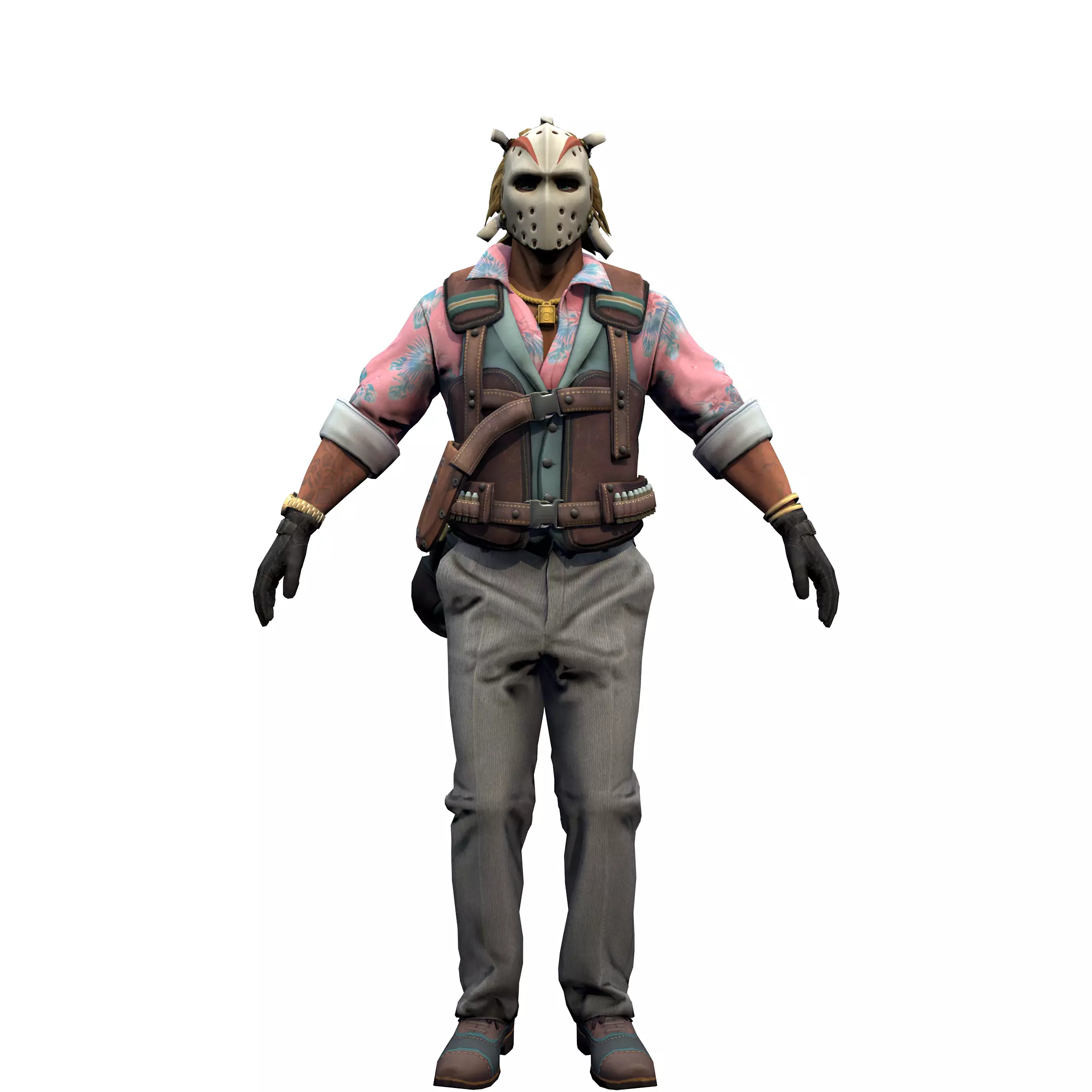 The leader of the Professionals is brash, witty, and frighteningly indifferent to the suffering of others. He describes himself as an ordinary guy who is not averse to having fun in the company of local armed collectors on weekends. He downplays the danger even in the most difficult situation - even if there is no one left alive but him, riddled with bullets, and only a few seconds remain for the explosion of the safe. Inspired by the 1980s aesthetic, he began wearing a white hockey mask and a floral shirt. Hair back, dark glasses over eyes.