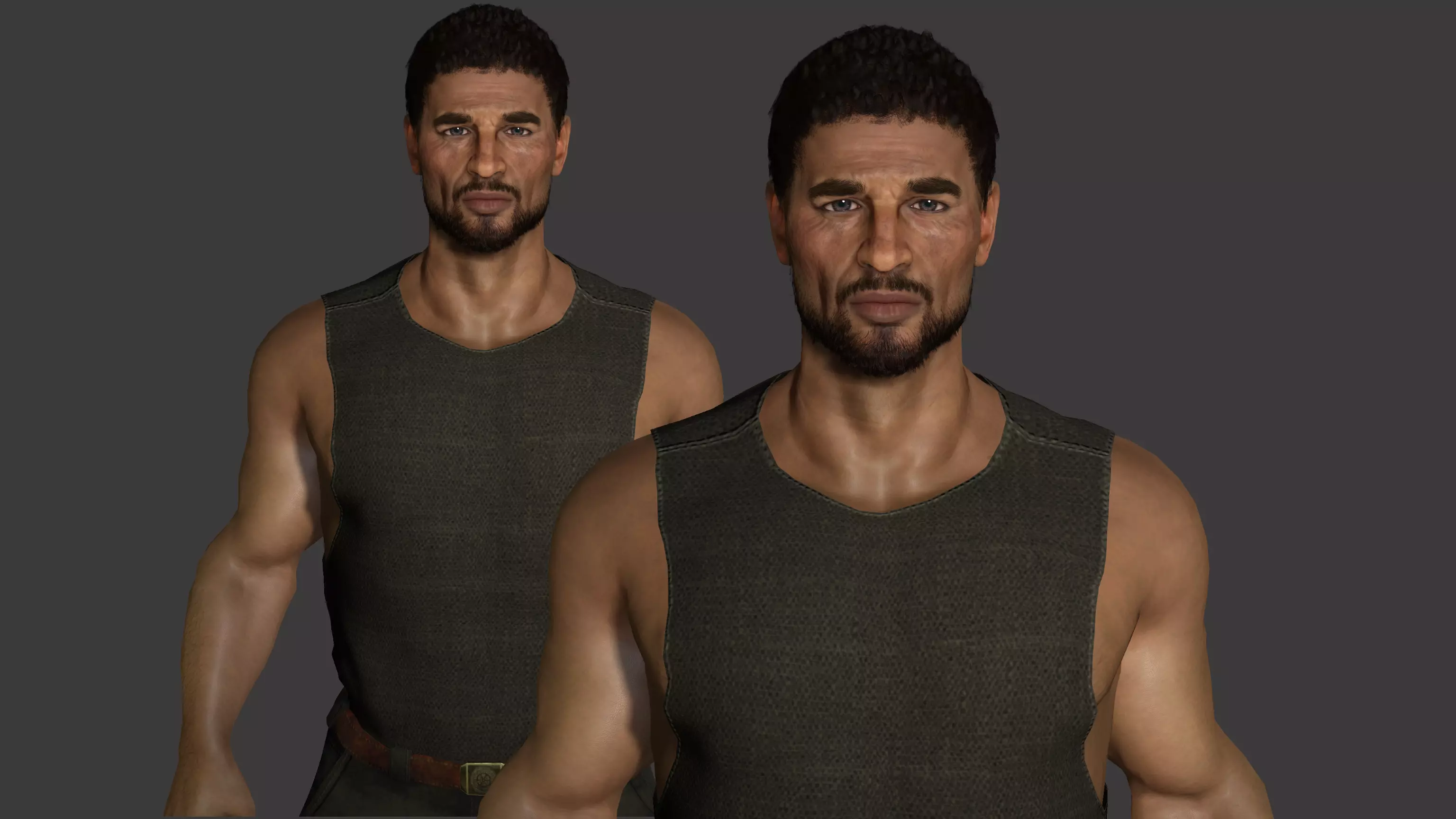 This high-quality 3D character features a strong, muscular male survivor designed for games, cinematics, VR/AR, and real-time environments. The model includes detailed PBR textures, realistic skin and hair, and a worn survival-style outfit consisting of a rugged tank top, distressed shorts, boots, and wrapped leg fabric.