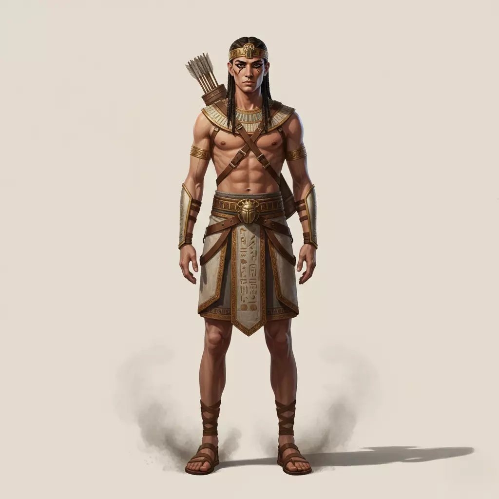 A highly detailed Ancient Egyptian Archer / Scout character designed for historical games, cinematic scenes, and stealth-based gameplay experiences.This agile and athletic male figure is presented in a strict, clean, symmetrical T-Pose, with both arms extended horizontally and hands completely empty, ensuring perfect compatibility for rigging, animation, and custom weapon attachment.