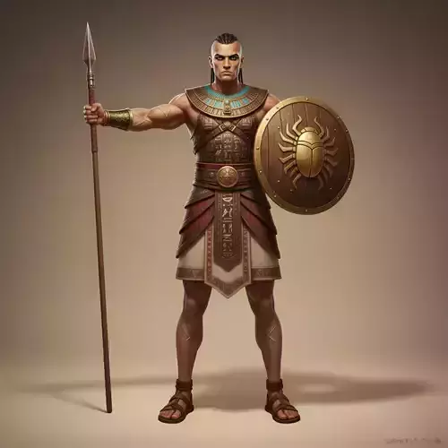 A detailed Ancient Egyptian Warrior character designed for historical games, cinematic productions, and VR combat experiences.This strong and alert male figure features a muscular physique and stern facial expression, equipped with bronze and leather chest armor engraved with golden hieroglyphs, a short decorated kilt, leather sandals, and gold and bronze bracers. He holds a spear and a round shield adorned with scarab motifs, projecting readiness for battle and authentic Egyptian combat style.