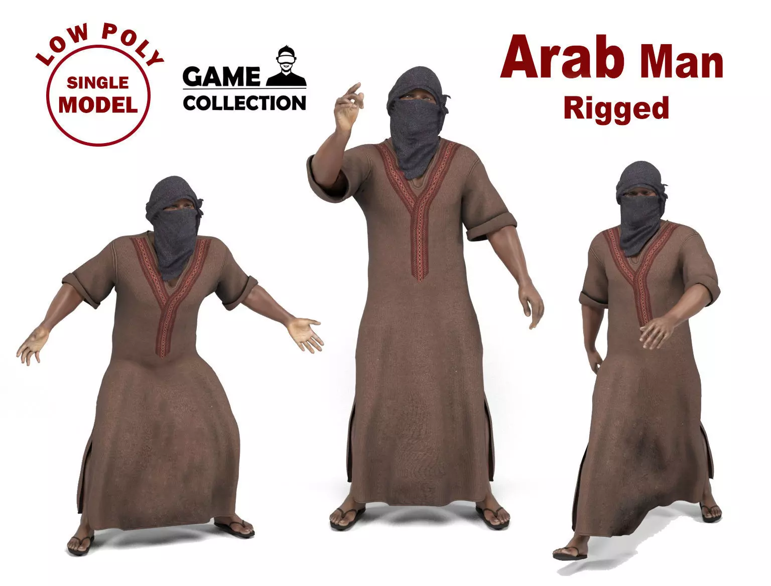 3D model of a Arab man with kaftan, hijab and sandals. The model includes bones and several animations. Model ideal to be used in games, advertising and video production. Low-poly models to be used easily in any project.