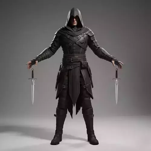 A high-detail 3D assassin rogue designed for stealth and action games.The character is a slim, athletic male, presented in T-Pose and front view, full body. He wears dark hooded leather armor with belts and daggers, and has a stealthy, focused expression.