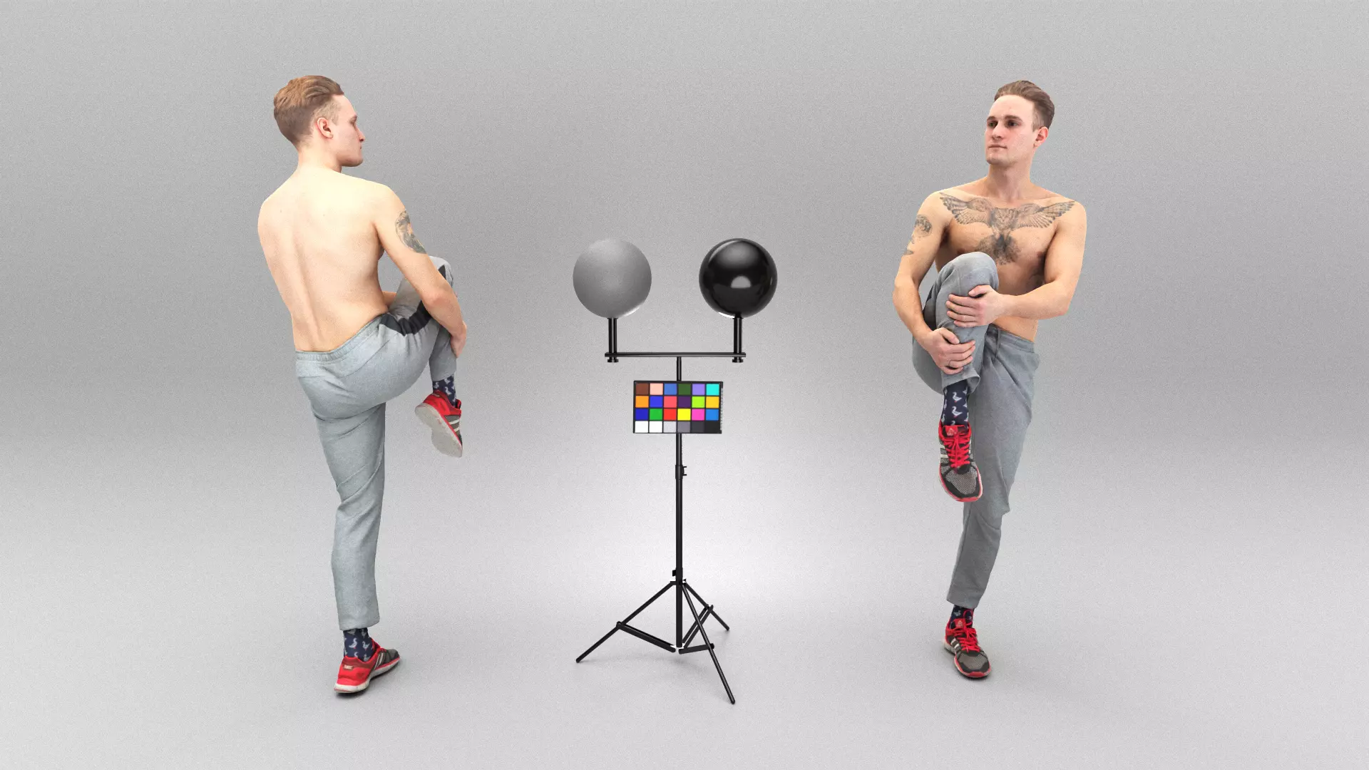 This is a true human size and detailed model of a sporty handsome young man of Caucasian appearance dressed in a sportswear. The model is captured in a casual pose to be perfectly matching to various architectural and product visualizations as a background, mid-sized or close-up character on a sport ground, gym, park, VR/AR content, etc.