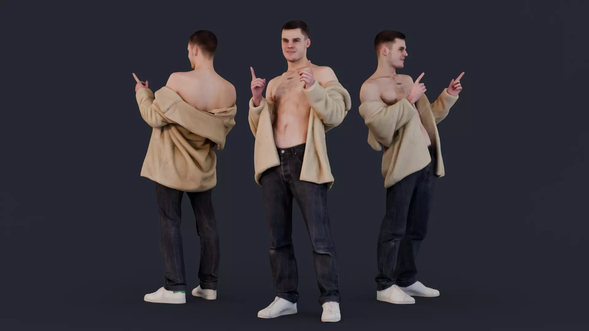 A bold and confident male figure pointing with both hands, wearing a tan open jacket, revealing his bare chest. His relaxed denim jeans and casual white sneakers add a contemporary street-style vibe. The playful and slightly mischievous expression makes him ideal for dynamic storytelling and character-driven scenes.