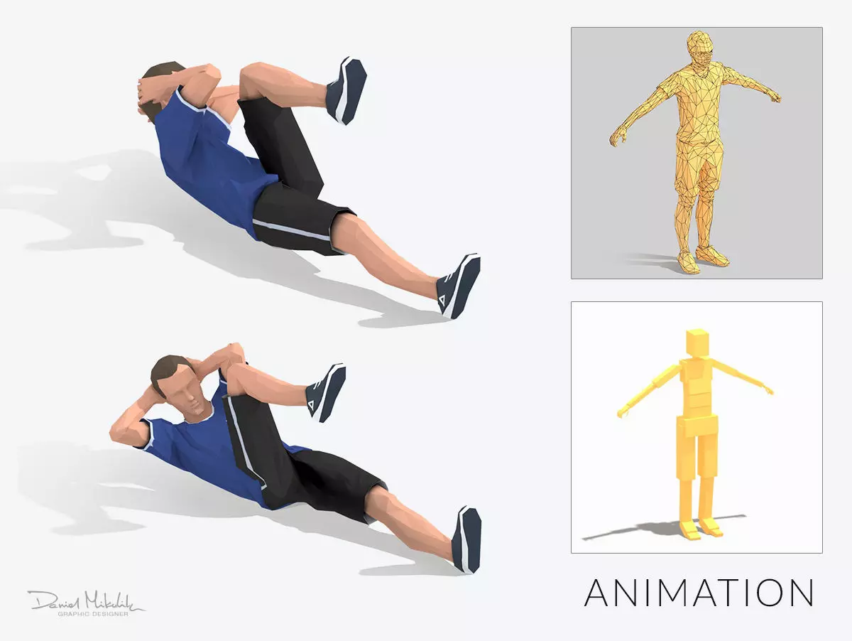 Animations of exercise Man Low poly3d model in flat surface style.Animation created in CAT system and exported to FBX files for loop sequence.Extra textures as bonus