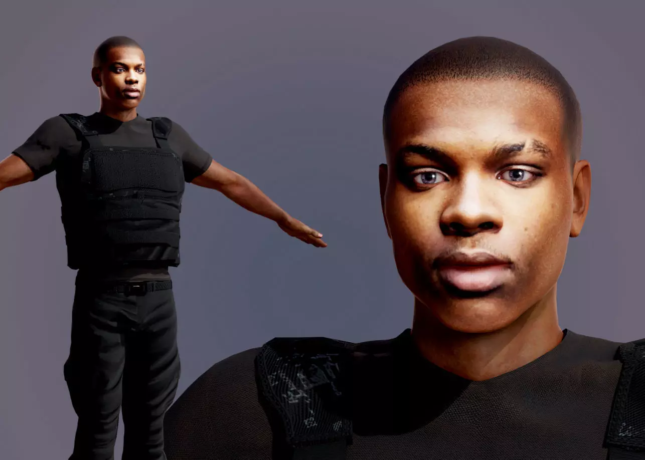 A simple realistic low poly and rigged model of a black male. He wears the body armor (bulletproof vest) but can be used without it too (then he appears just as a normal dude in black T-Shirt)