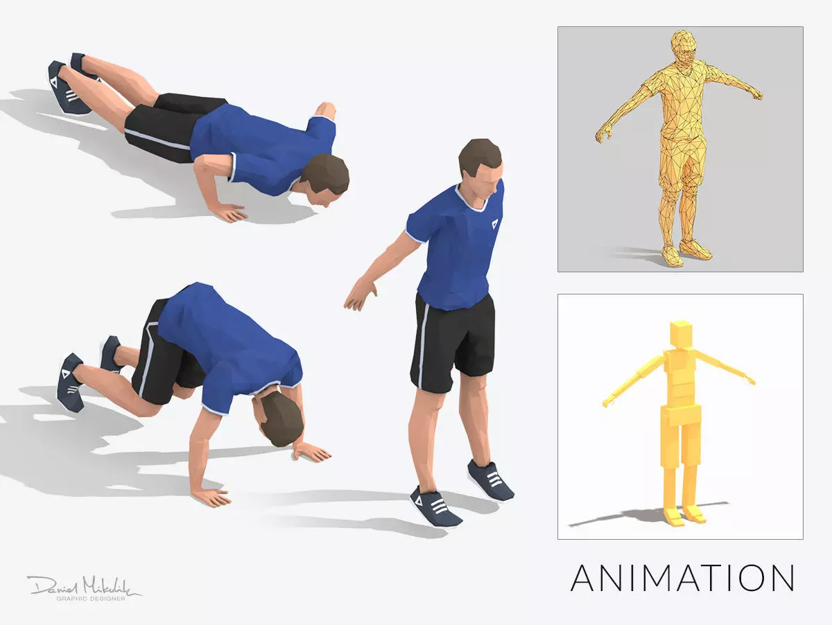 Animations of exercise Man Low poly3d model in flat surface style.Animation created in CAT system and exported to FBX files for loop sequence.Extra textures as bonus