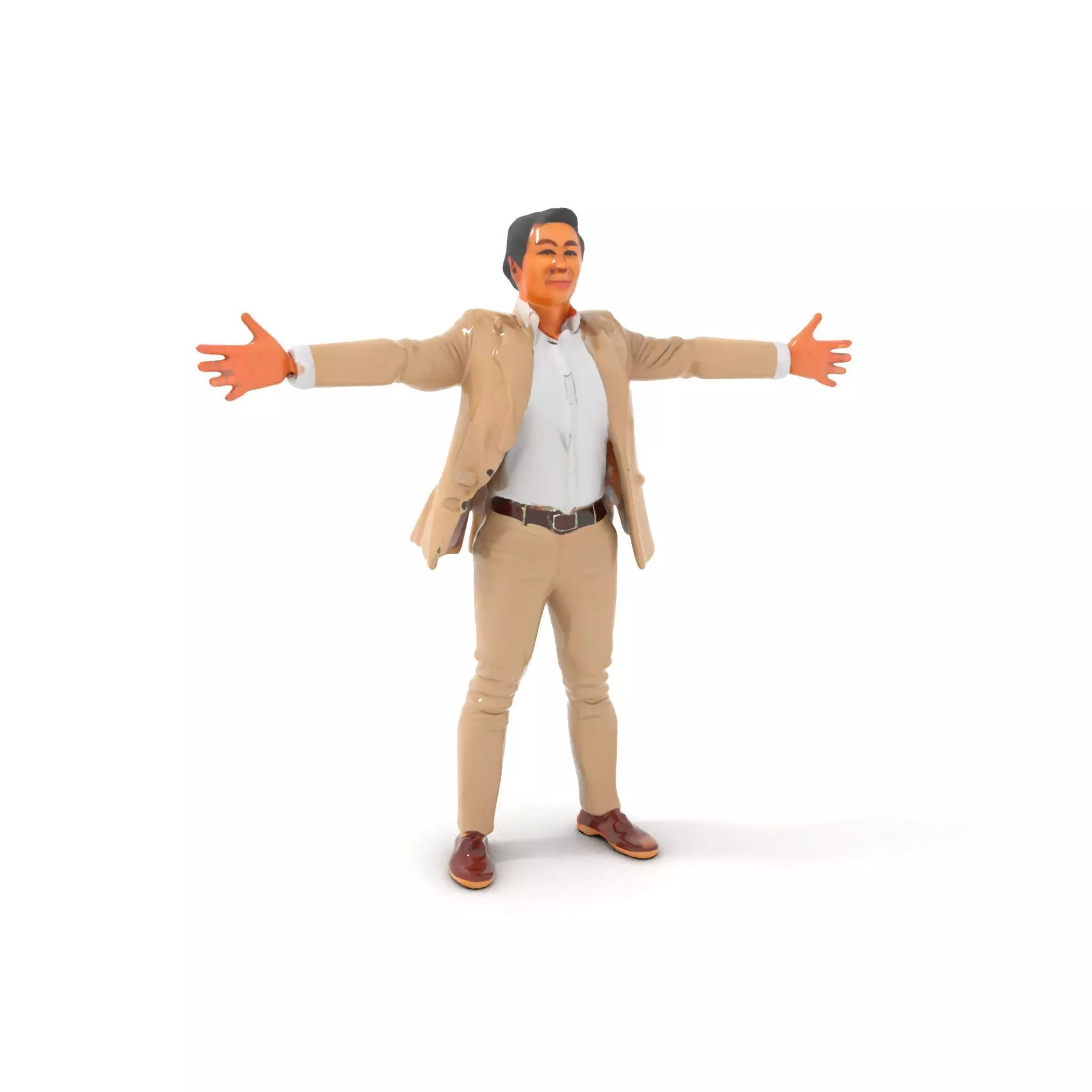 This 3D model pack features a professionally dressed businessman in a beige suit. Each model has 3 levels of detail: low-poly (1000 triangles for mobile), middle-poly (10,000 triangles for environment), and high-poly (100,000 triangles), which allows for the use of this model in production rendering (such as 3ds Max, Maya, Cinema 4D, Blender, V-Ray/Corona/Cycles, and all others), game engines (Unity and Unreal compatible), and interactive presentations, providing a choice of detail based on the LOD System principle. Ideal for corporate presentations, educational simulations, and virtual event scenes. The model's textures are PBR, Diffuse, NormalMap, and reflection/roughness/metallic, which are suitable for any modern rendering engine. All models accurately unwrapped with no overlapping UVs. All textures are 4096*4096 in size. The first image is the reference used for creating the 3D model. It is important to carefully evaluate the quality of the model by examining the preview images that display the topology and polygonal mesh. These previews (WIRE and WEB 3D Preview) clearly demonstrate how accurately the model matches the original reference and how well the geometry has been executed. If you like this model, please leave a comment and a like!