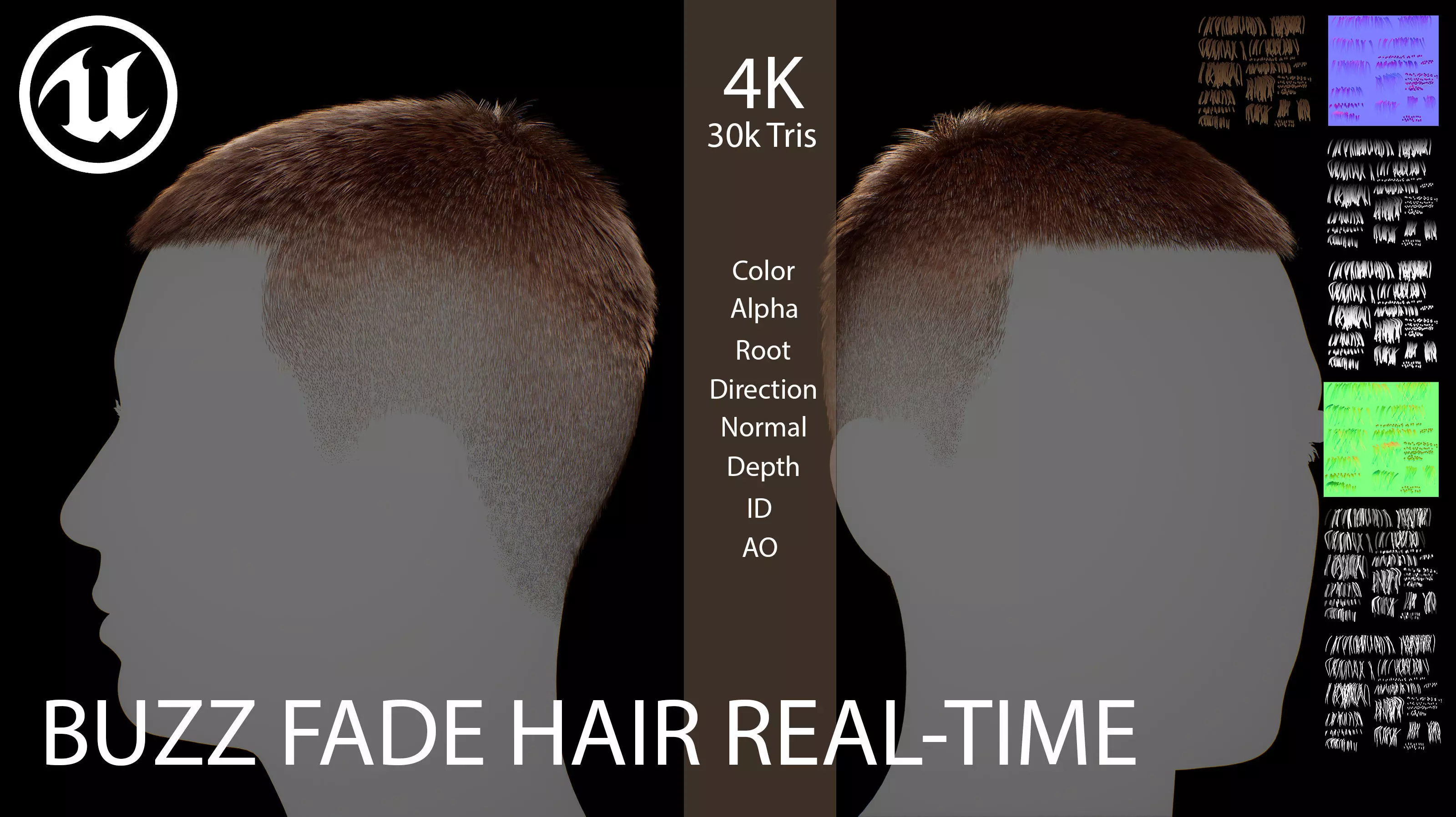 Buzz Cut Fade - Game-Ready Real-Time Hair asset created for games, cinematics, and other real-time applications. The hair textures were created in FiberShop and optimized for Unreal Engine 4 and 5, offering a good balance of performance and visual quality.