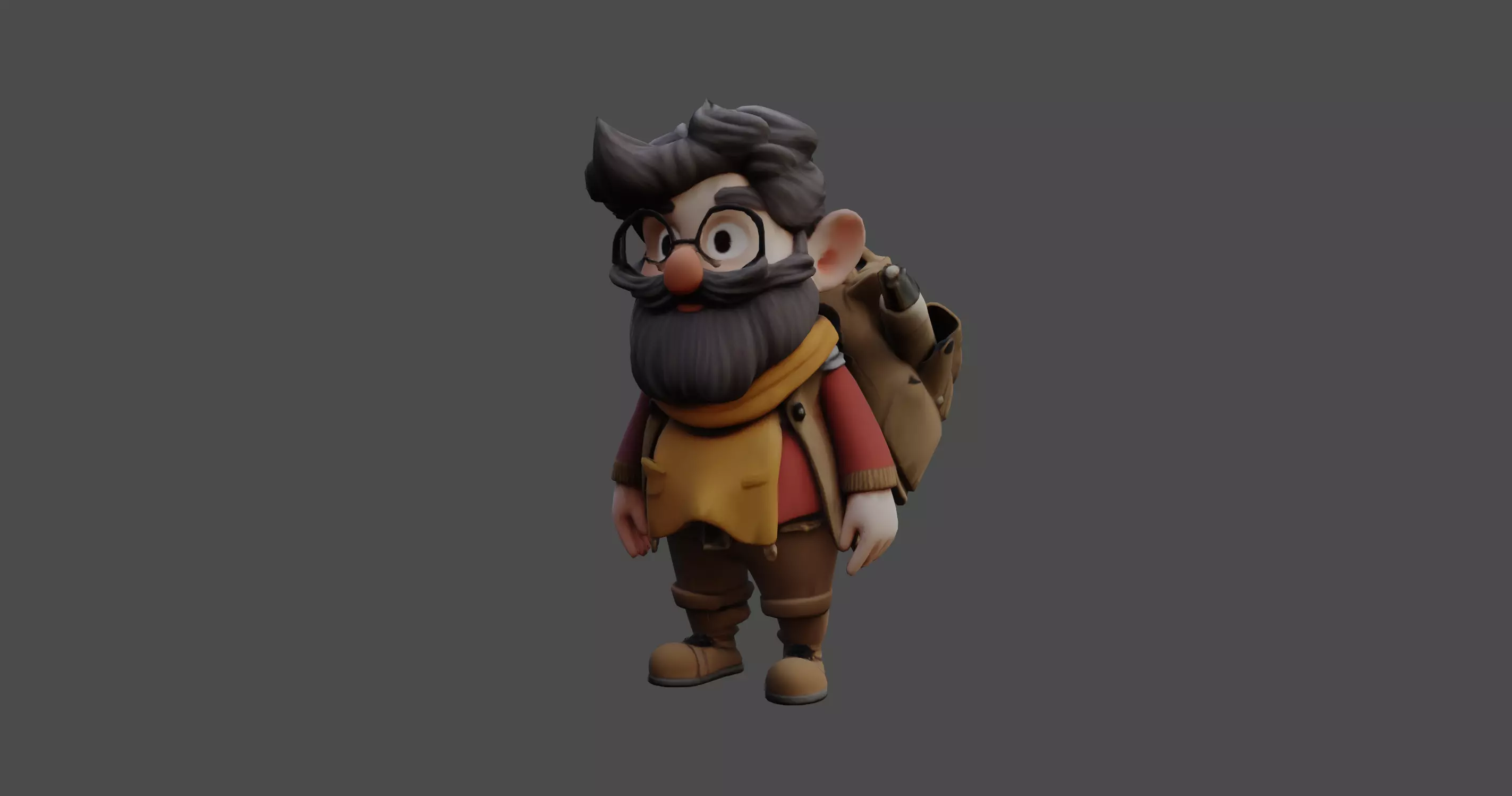 This stylized 3D character model features a charming and adventurous explorer, designed in a cute cartoon style. With his bushy beard, round glasses, and warm clothing, he exudes the spirit of a seasoned traveler. His outfit includes a cozy scarf, a rugged vest, and sturdy boots, all modeled with great attention to texture and detail. The model maintains a high-quality sculpt with smooth topology, making it ideal for animations, games, or digital artwork.