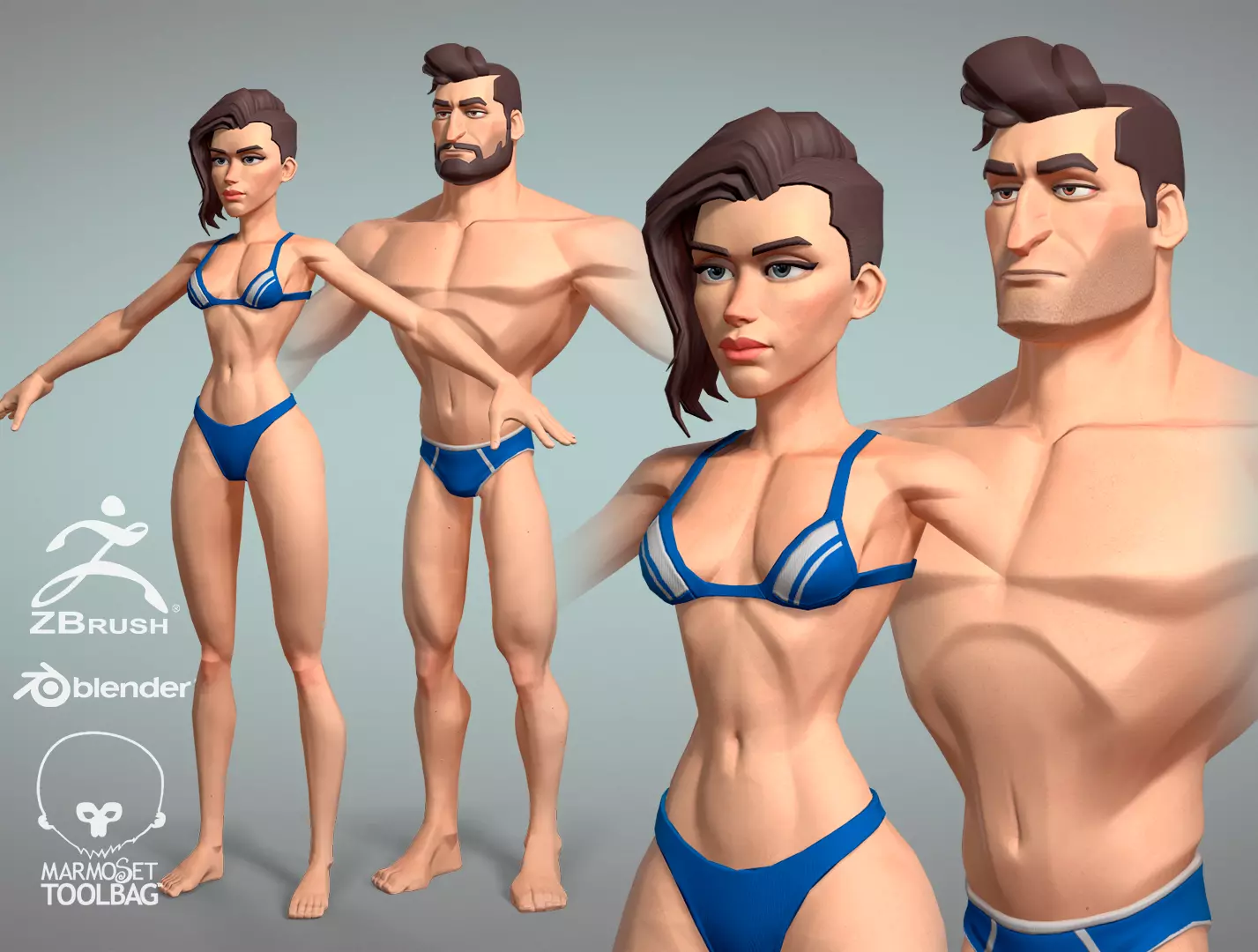 Cartoon male and female Character Hugh and Meg base mesh Low-poly 3D model