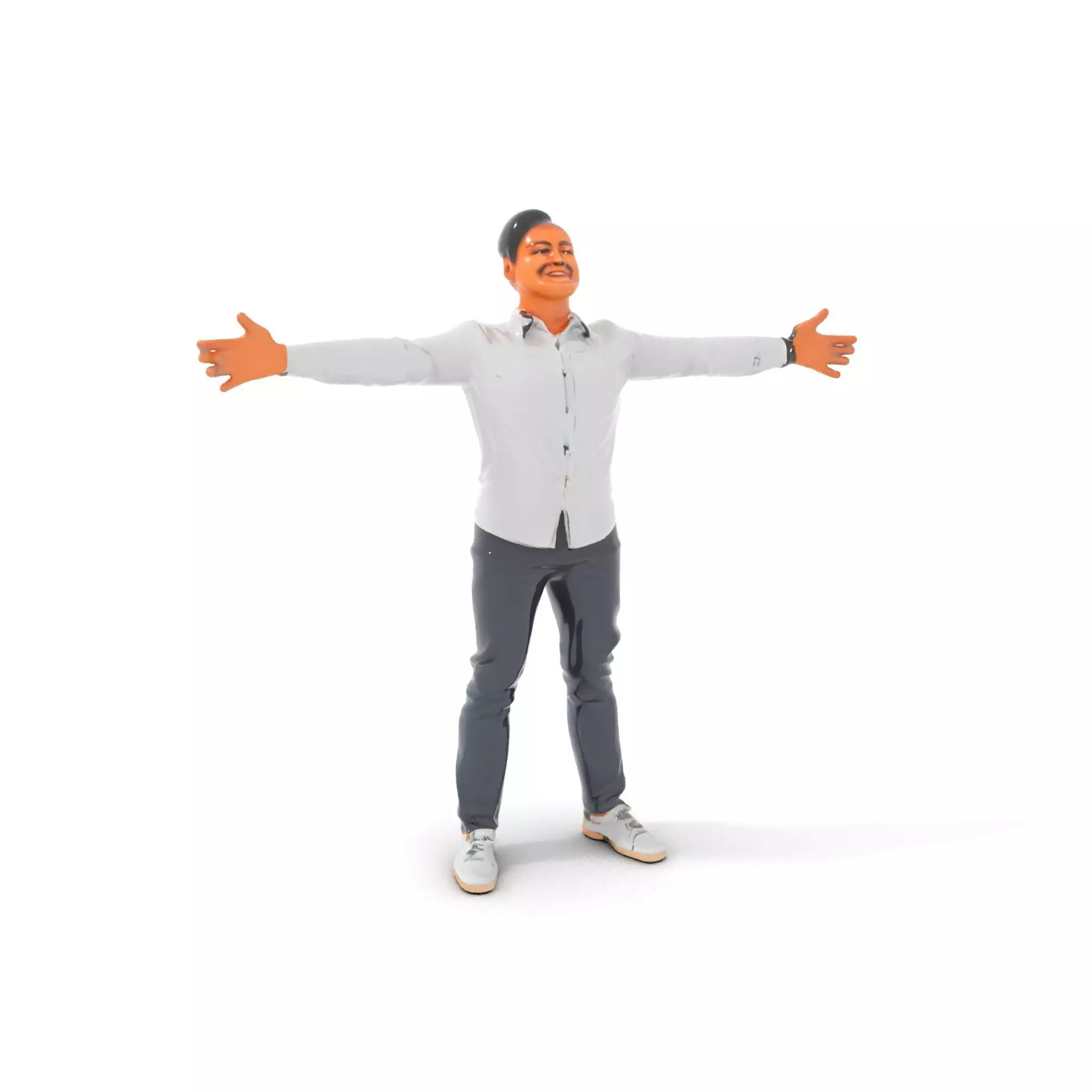This 3D model pack features a male figure in a casual outfit with arms outstretched, offering versatility for animation and interactive applications. Each model has 3 levels of detail: low-poly (1000 triangles for mobile), middle-poly (10,000 triangles for environment), and high-poly (100,000 triangles), which allows for the use of this model in production rendering (such as 3ds Max, Maya, Cinema 4D, Blender, Vray/Corona/Cycles, and all others), game engines (Unity and Unreal compatible), and interactive presentations, providing a choice of detail based on the LOD System principle. Ideal for character animations, virtual reality environments, and promotional content. The model's textures are PBR, Diffuse, NormalMap, and reflection/roughness/metallic, which are suitable for any modern rendering engine. All models are accurately unwrapped and have no overlapping UV. All textures are 4096*4096 in size. The first image is the reference used for creating the 3D model. It is important to carefully evaluate the quality of the model by examining the preview images that display the topology and polygonal mesh. These previews (WIRE and WEB 3D Preview) clearly demonstrate how accurately the model matches the original reference and how well the geometry has been executed. Please like and leave a comment for the model if you found it useful.