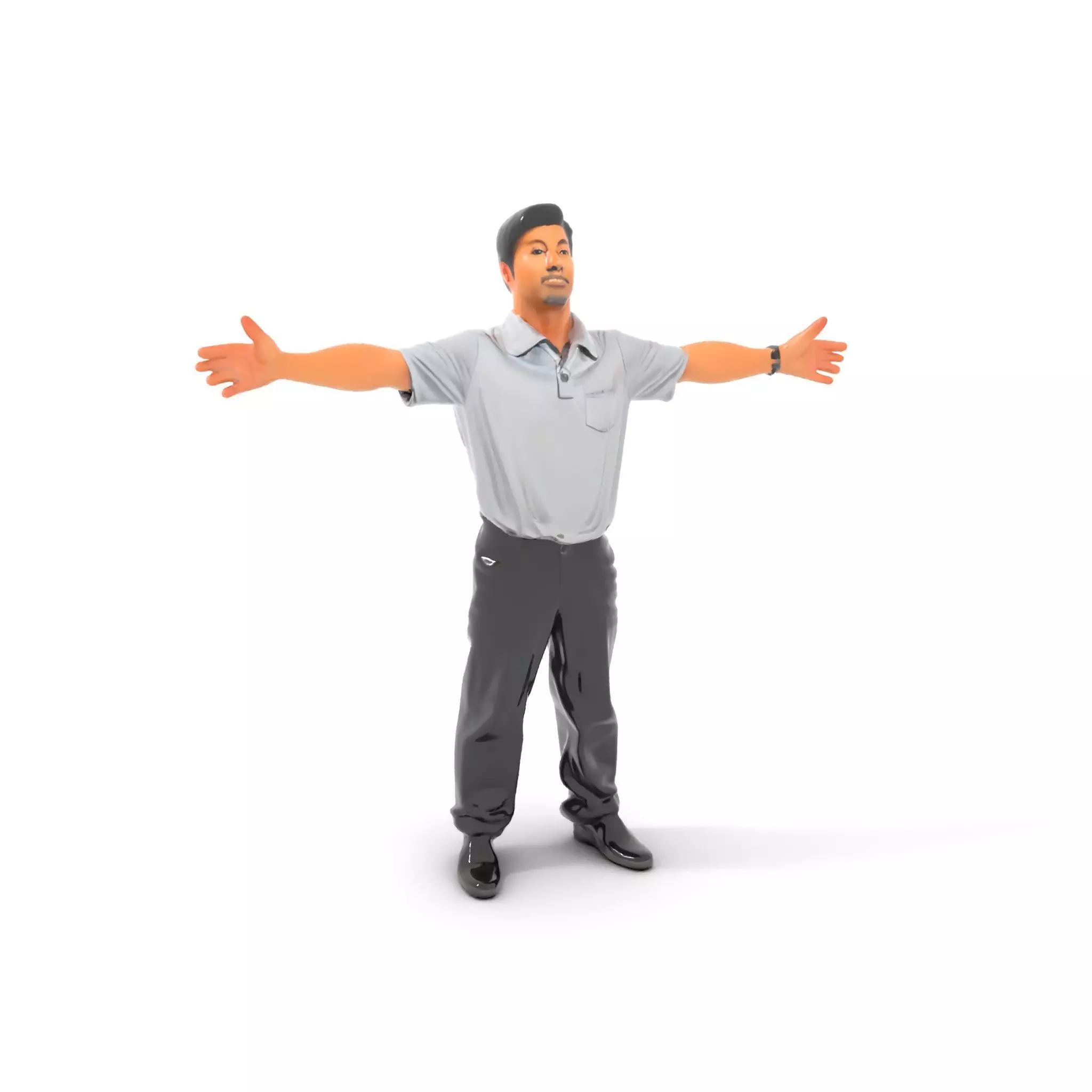 This 3D model pack features a casually dressed male character with outstretched arms, perfect for various digital scenarios. Each model has 3 levels of detail: low-poly (1000 triangles for mobile), mid-poly (10,000 triangles for environment), and high-poly (100,000 triangles) for production rendering in applications like 3ds Max, Maya, Cinema4D, Blender, Unity, and Unreal Engine. Ideal for animations, games, VR simulations, and visual presentations. The textures are PBR with Diffuse, NormalMap, and reflection/roughness/metallic, with a resolution of 4096x4096. All models are accurately unwrapped with no overlapping UVs. The first image is the reference used for creating the 3D model. It is important to carefully evaluate the quality of the model by examining the preview images that display the topology and polygonal mesh. These previews (WIRE and WEB 3D Preview) clearly demonstrate how accurately the model matches the original reference and how well the geometry has been executed. If you like this model, please leave a comment and like!
