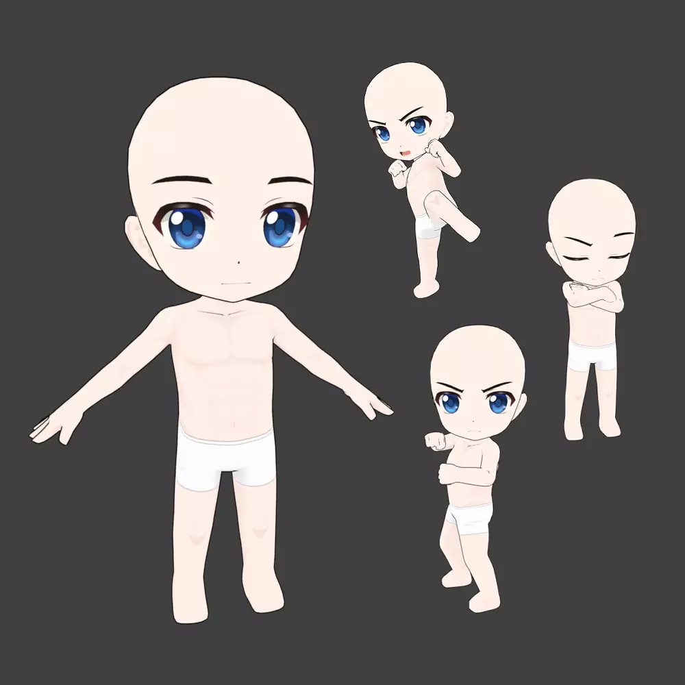 This is a stylized chibi male base character designed for anime and cartoon-style projects.The model includes a full-body rig, corrective shape keys, and multiple facial expressions for expressive and natural animation.