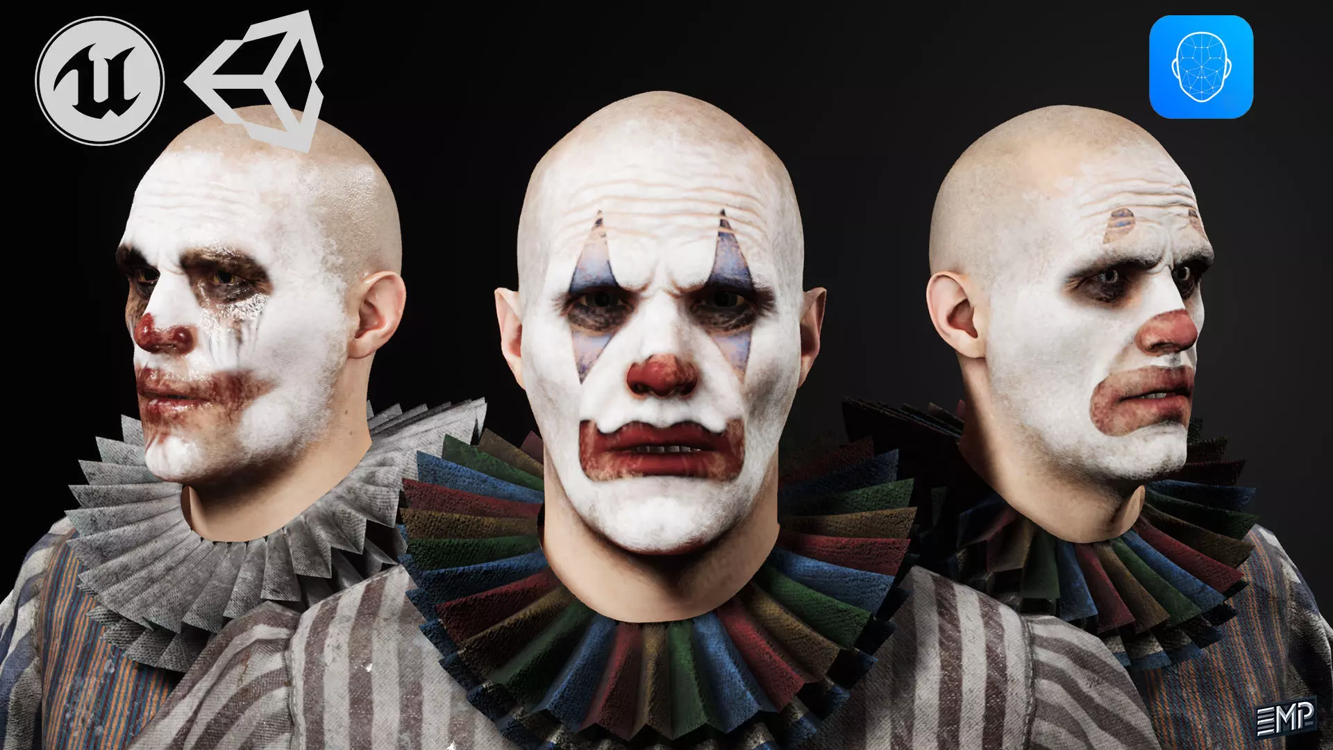 _ Polycount_Clown - Faces 45.044 - Tris 90.088 - Verts 48.456Clown has different PBR textures.39 textures all 409612 materials2 Eye material instance1 Subsurface profile (skin)