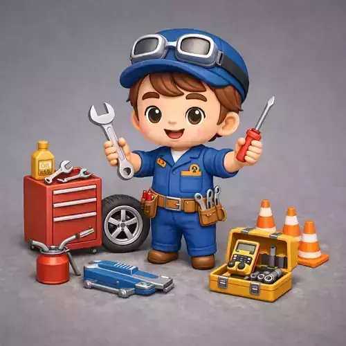 Cute stylized kid mechanic character ready for use in games, animation, and illustrations.He’s wearing a blue garage uniform with cap and goggles, surrounded by detailed workshop props like a tool chest, jack, toolbox, cones and oil can – perfect for car service or repair-shop scenes.