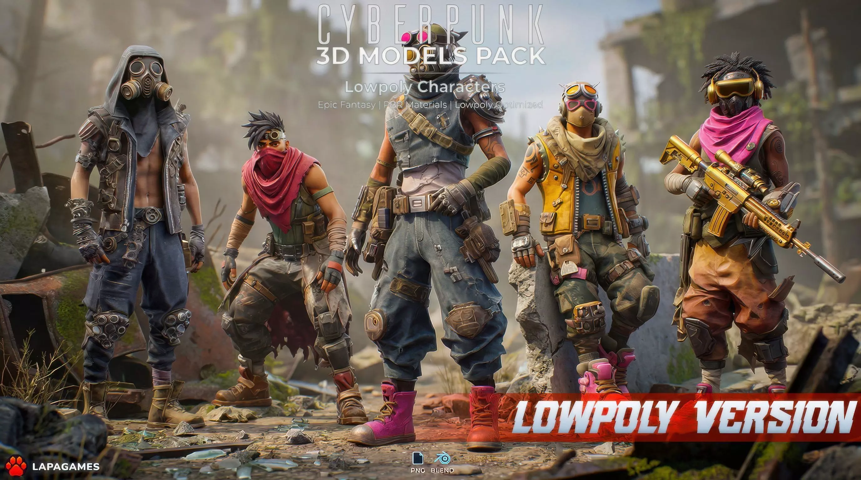 Lowpoly stylized cyberpunk charactersStrong silhouettes and readable designsDistinct outfits and gear variationsGame-ready geometryOptimized for real-time renderingSuitable for customization and kitbashing