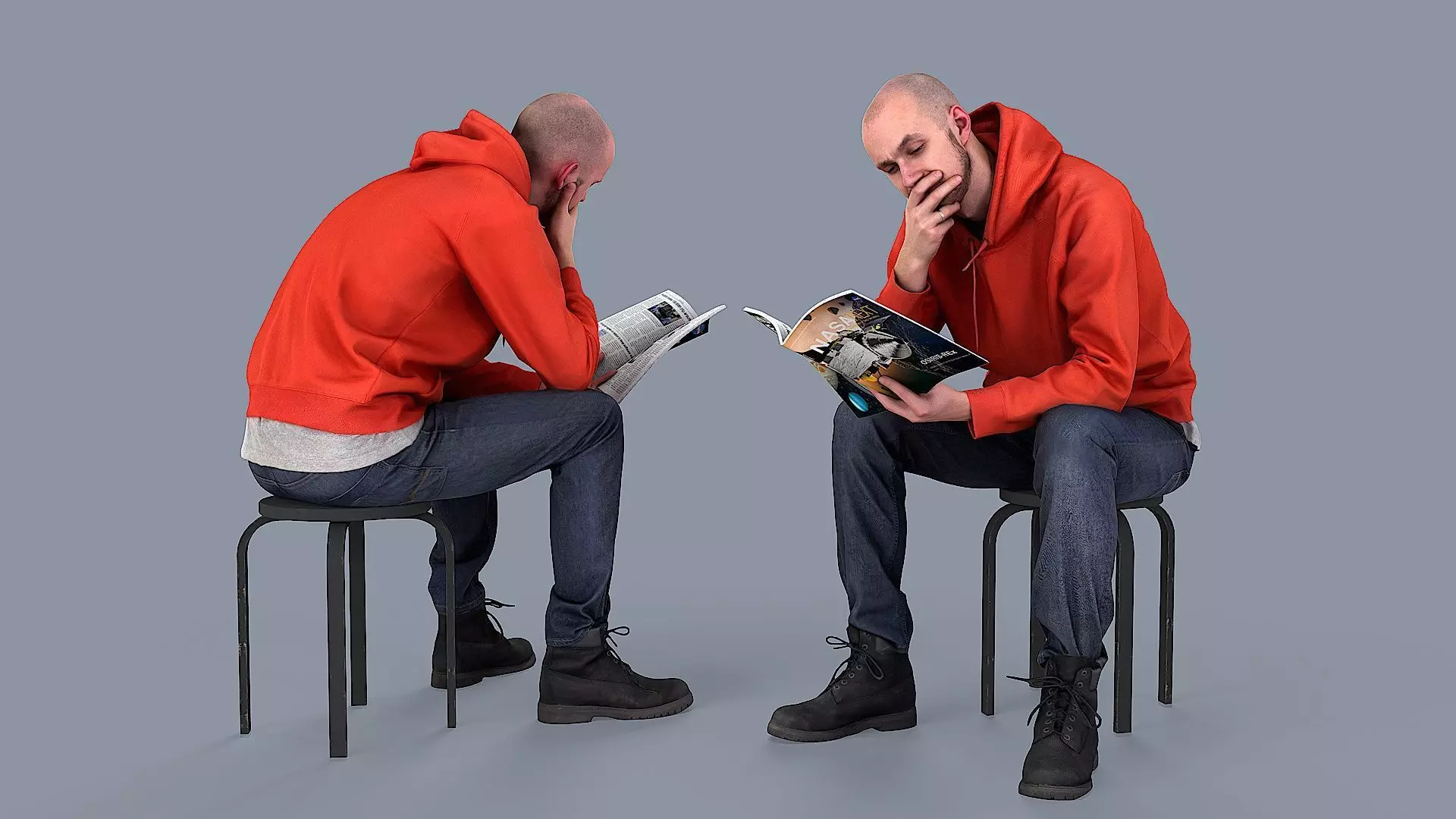 This 3D model portrays a young, tall, and bald man engrossed in reading a NASA NEXT magazine. He's sitting down with one hand holding the magazine and the other propping his chin, denoting his deep focus. He's wearing a ginger hoodie, blue jeans, and black boots, signifying a casual yet stylish outlook.